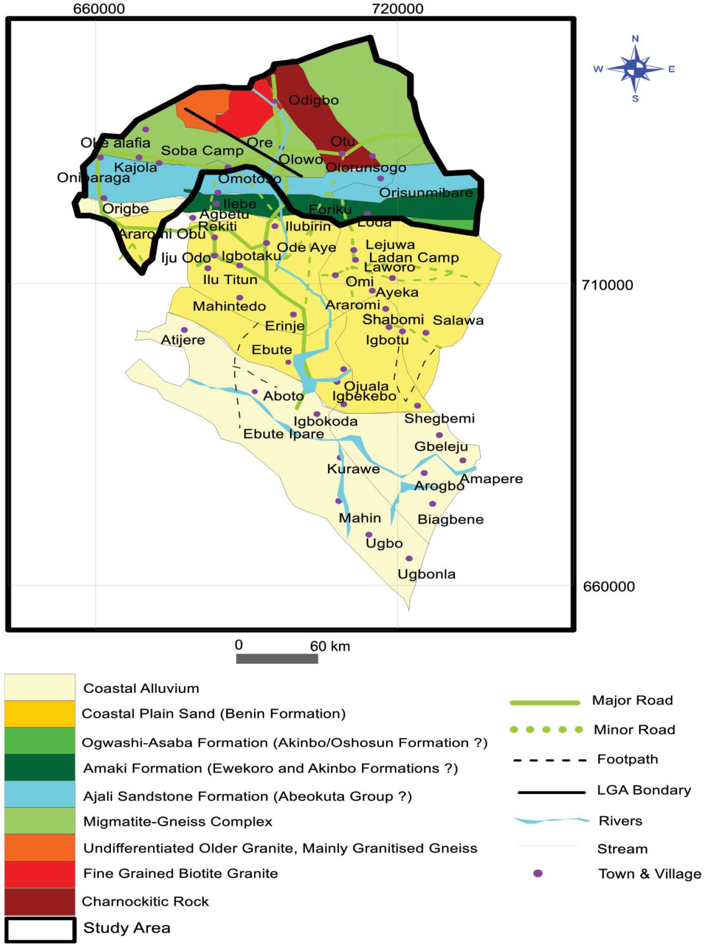 The study area is Odigbo Local Government of Ondo State. The area can access through Akure – Ore Lagos – Benin highways and is located within latitude 715000–75500 mN and longitude 664750–725000 mE (Figure 1). Major part of the study area is devoted to agricultural and commercial activities. The study area falls within the tropical rainforest climate. The average temperature is 25 °C. Relative humidity of the area differs within 70% to 80%. The average annual rainfall of the study area is about 1500 mm and 2500 mm [23]. The topographic elevation ranges from 110–185 m. The northern area falls within the geologic terrain, underlain by the Precambrian basement complex rocks of southwestern Nigeria, characterized by the migmatite-gneiss complex, older granites, charnockites, quartzite and minor intrusive lithologies [24–25]. The local geology consists of charnockite, fine grained biotite granite and gneiss in the north (Figures 2 and 3). Field observation shows that biotite granites in the area occur as large igneous bodies, and largely coarse grained. However the southern parts of the study area is underlain by Coastal plain sands of Benin formation; Ewekoro and Akinbo; and Abeokuta formations (Figure 2).