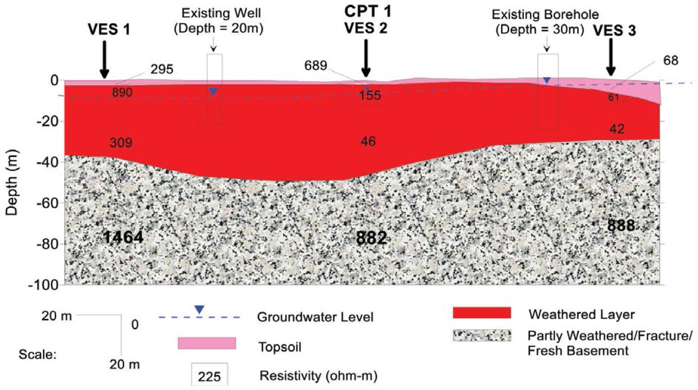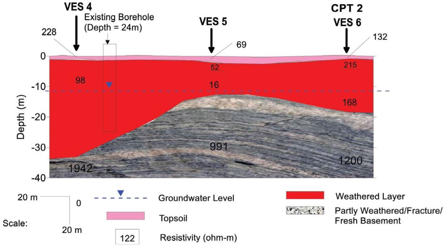 The VES curves identified in the area are H, QH, and KH types with three to four geoelectric layer combinations. The QH curve type predominates, constituting 50% of the total, the KH curve type constitutes 33.3% and H curve type constitute 16.7%. The geoelectric section along Traverse 1 in Odigbo (Figure 4) identified maximum of four geoelectric/geologic subsurface layers comprising the topsoil, weathered layer, partly weathered/fractured basement/fresh basement. The topsoil varies in composition from clay to clayey sand, sandy clay and lateritic clay with resistivity values ranges from 68 to 689 ohm-m and thickness varies from 0.9–2.5 m. The resistivity of this layer has average of 200 ohm-m whose geoelectric characteristic is typical of sandy clay. The weathered layer resistivities are generally within the range of 46 and 890 ohm-m, typical of clay, clayey sand, and laterite. Resistivity in the range of 40–200 ohm-m is the most dominant, signifying a clayey weathered layer, The thickness is moderately thick with values varying from 12.7 m to 20.5 m and generally. The partly weathered/fractured basement/fresh basement has layer resistivity values vary from 882–1464 ohm-m. The depth to (overburden thickness) this layer is in between 15.2–22.1 m. Information gathered from existing hand dug well and boreholes shows that the groundwater level varies from 7.4 to 9.5 m. Therefore the weathered layer could be stabilized prior construction to improve the geotechnical properties since it's predominantly clayey. This would reduce consolidation settlement usually associated with clay. The thickness of the topsoil is very thin to accommodate civil engineering foundation structure because the upper 1 m is usually removed during construction to guide against undue settlement arising from buried/decayed plants and animals. The groundwater level ranges between 4.5–6.2 m.