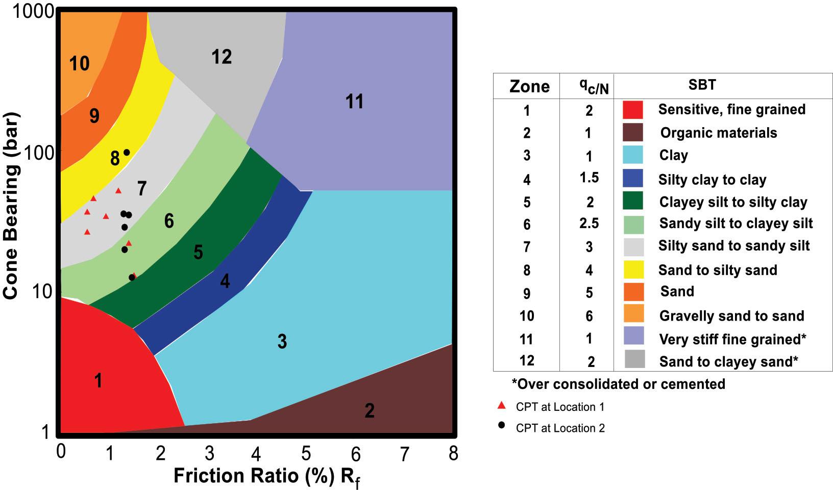 Robertson Chart for the soil classification using cone resistance and friction ratio values.