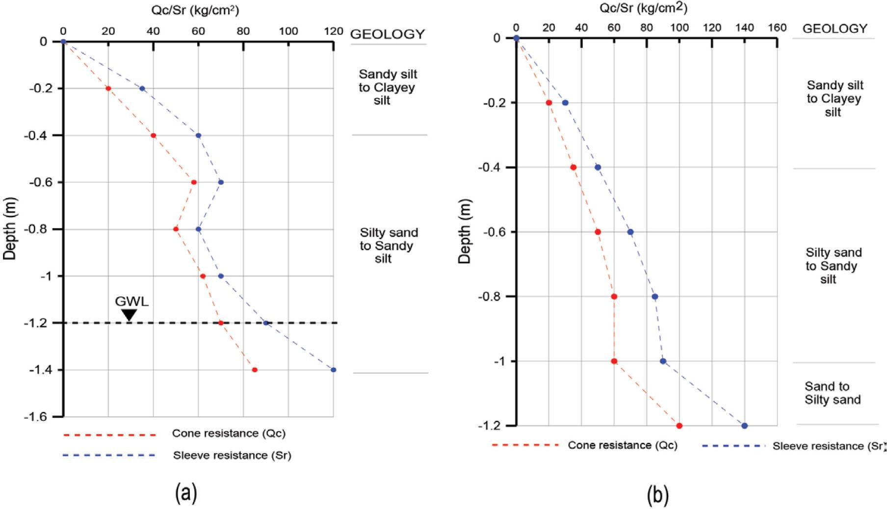 | Depth (m) | CPT 1 | CPT 2 | ||