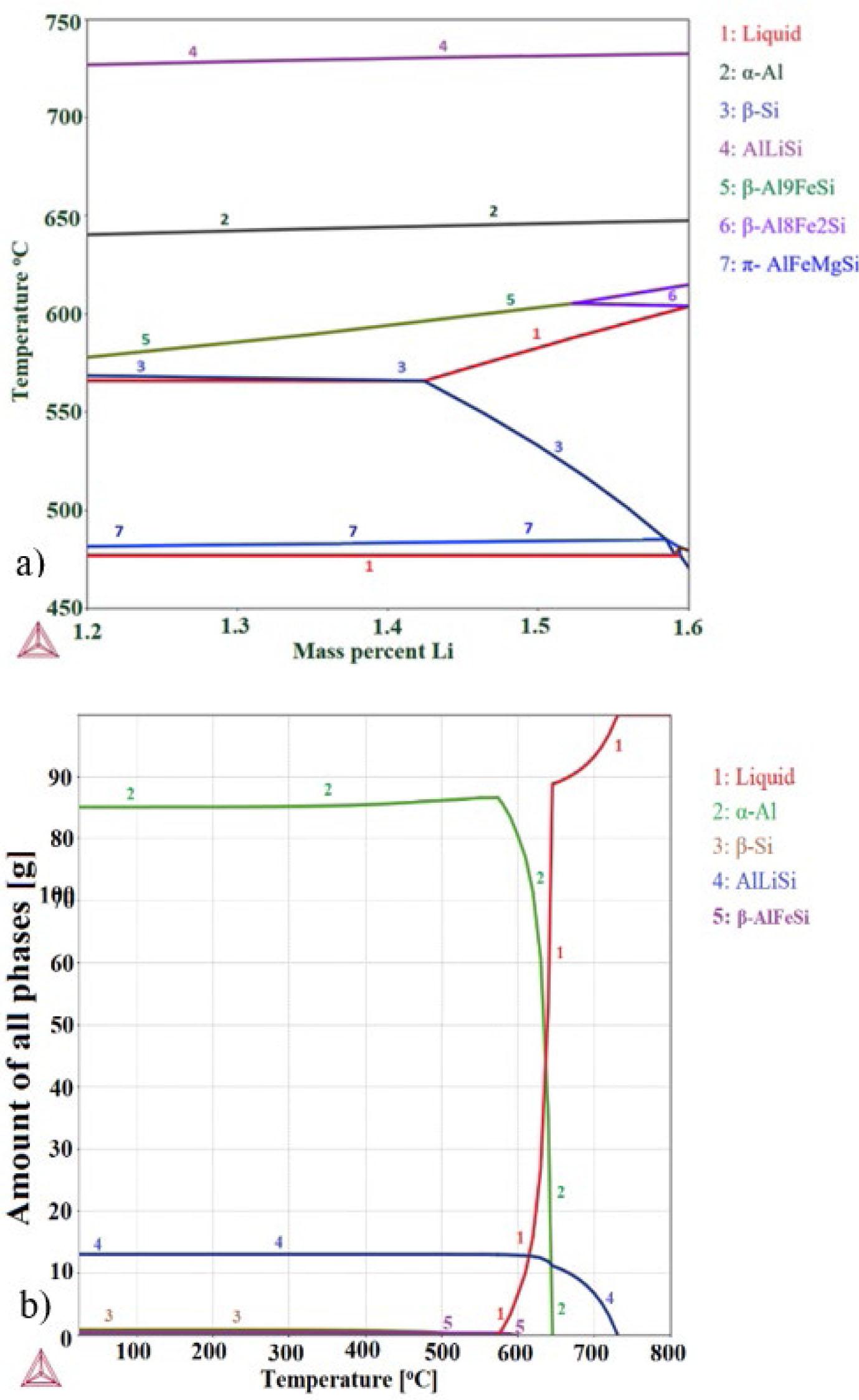 Thermodynamic description of system Al-Si7MgLi cast alloys was constructed using ThermoCalc software. From the chemical composition in Table 1 the solidification and equilibrium phases were calculated for experimental alloy. According to the thermodynamic equilibrium calculation we have predicted solidification of the primary α-Al, β-Si, new phases (AlLiSi), Mg2Si, iron bearing phase π-AlMgFeSi and β-AlFeSi.