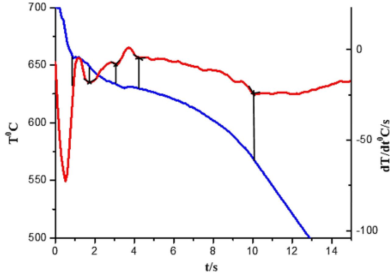 The cooling curve and differentiated curves of AlSi7MgLi alloy.