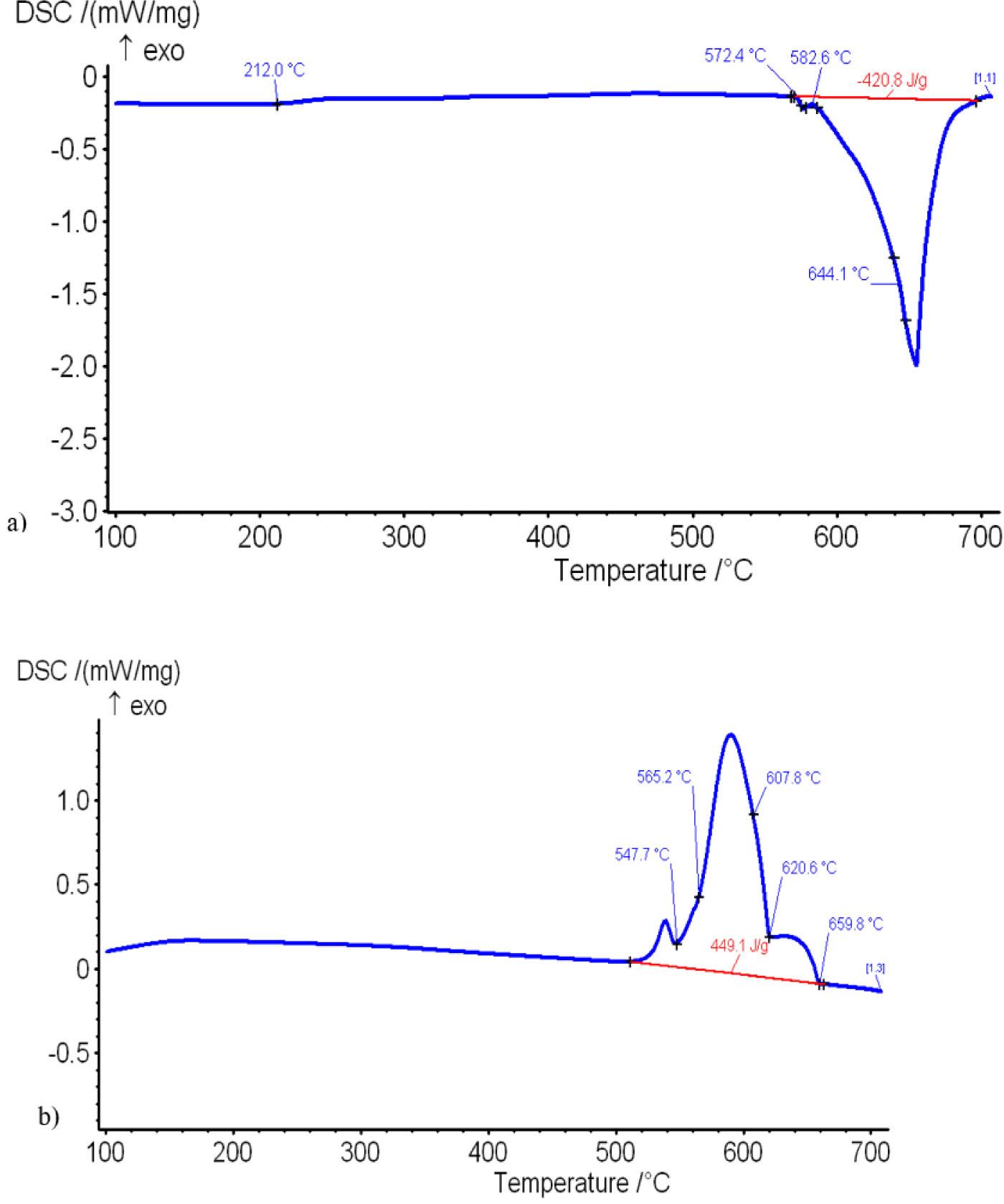 Heating DSC curve (a) and cooling DSC curve (b) of AlSi7MgLi alloy.