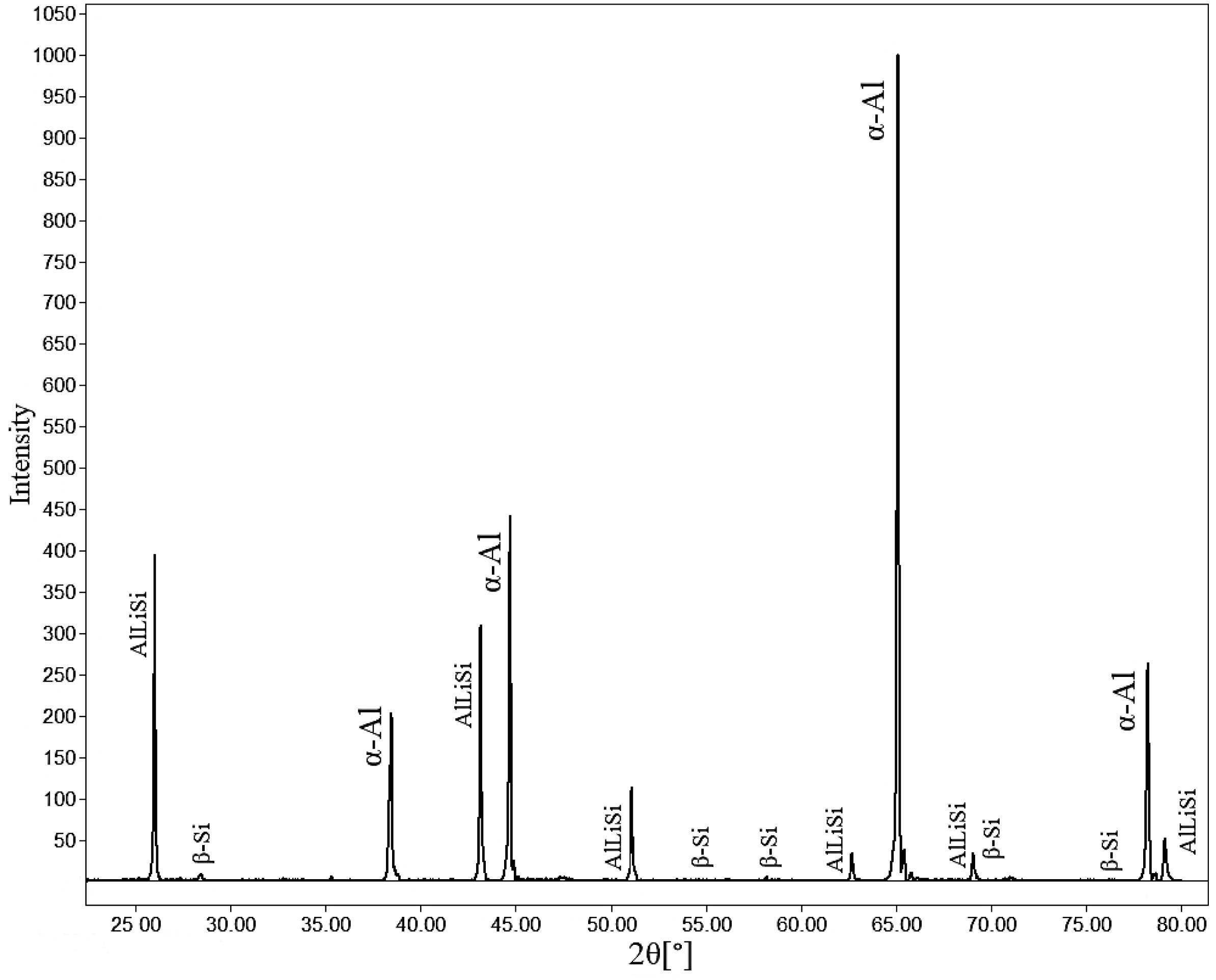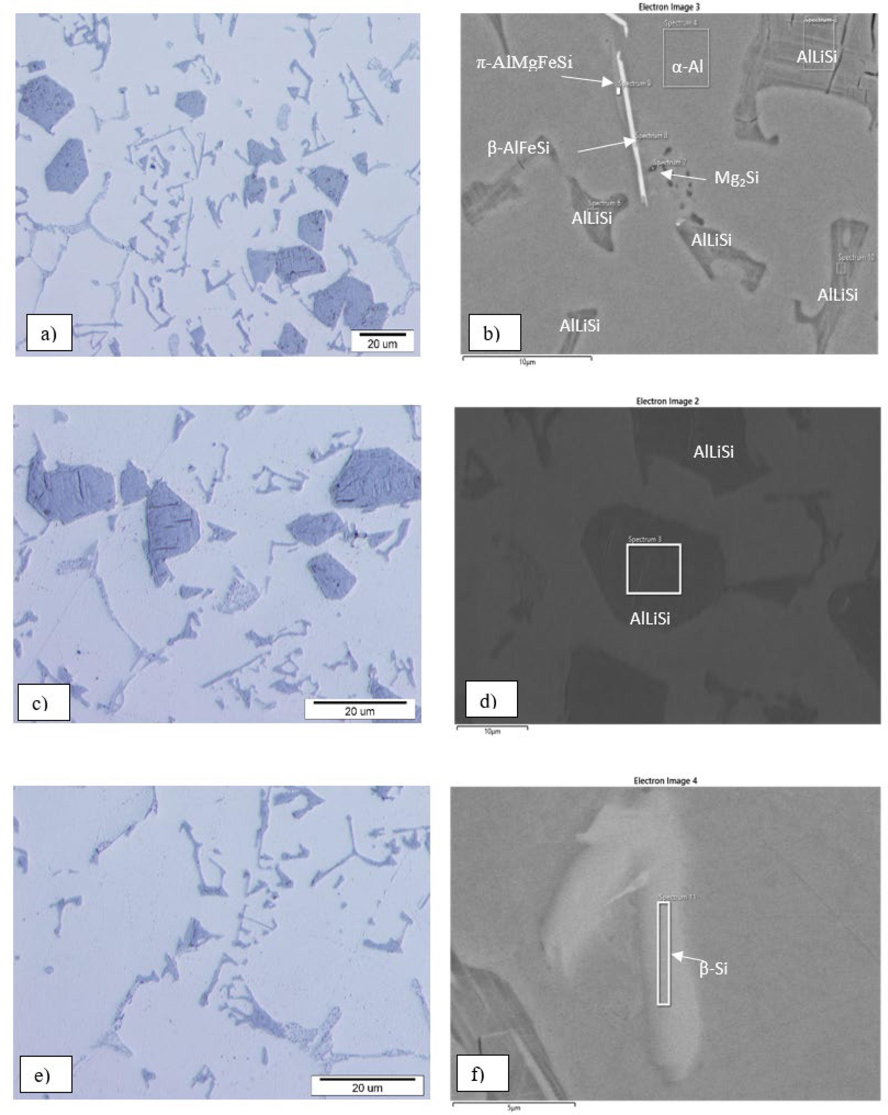 After analysis of solidification by thermal analysis technique samples were prepared for metallographic investigation. According to micrographs the microstructure consists of α-Al phase, AlLiSi phase, π-AlMgFeSi phase, Mg2Si which they are confirmed by EDS and XRD analysis and they presented in Figure 4b, 4d, 4f and Figure 5. With SEM we observed phases which they are formed with Li addition. From Figure 4 it can be concluded that new phase AlLiSi appears. According to thermocalc calcalucaltion the elemental composition of phase present as-cast state alloy the percentage of each element in the phase of AlLiSi is 33 wt %, after analysis by SEM-EDS it was proved that AlSi contain lithium according to the thermodynamic calculation. Furthermore, microstructure in the alloy with Li addition consists from α-Al, β-AlFeSi, π-AlMgFeSi and Mg2Si. With XRD analysis we observed phases which they are formed with Li addition. From Figure 5 we confirm the formations of alpha α-Al, AlLiSi phases and β-Si.