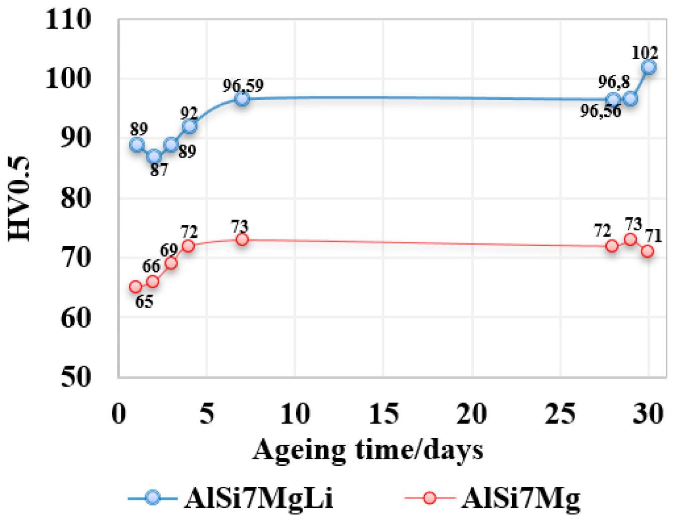 Hardness test analysis for sample AlSi7MgLi showed the hardness for first day was 89 HV as cast state. After 24 hours of ageing, the hardness of sample dropped until 87 HV. After 2 to 7 days hardness of AlSi7MgLi alloy increased gradually from 87 HV to 96 HV where plateau is reached at 96 HV. It can be concluded that peak of hardness was achieved after 30 days at 102 HV. Our research showed that value of hardness increased during 30 days of ageing time from 65–73 at AlSi7Mg whereas at AlSi7Mg with Li addition from 89–102 HV. According to results of both alloys, the Li addition to AlSi7Mg has great influence on increasing of hardness compared to AlSi7Mg.