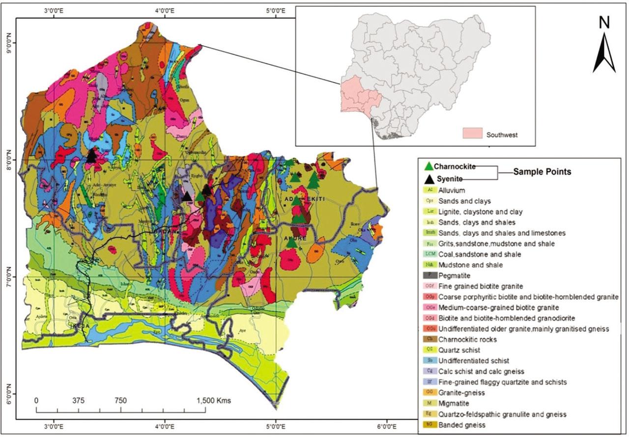 Geological map of southwestern Nigeria showing the sampling points. (Modified after the Nigerian Geological Survey Agency [5]).