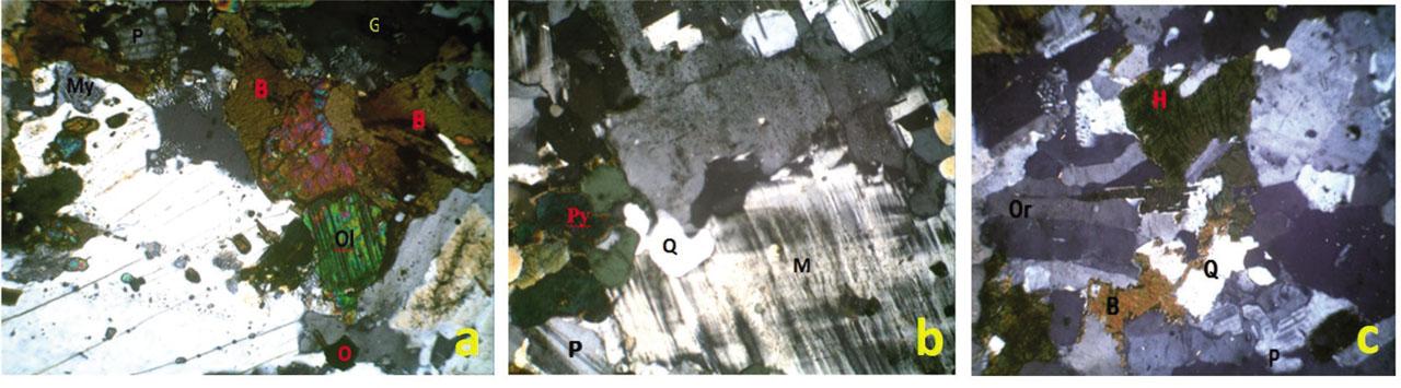 Photomicrograph of syenites from: (a) Okeho showing B = biotite, P = plagioclase, Ol = Oolivine, My = mymerkite, O = opaque, G = garnet (b) Iwo showing Q = qQuartz, M = microcline, P = plagioclase, Py = pyroxene (c) Kajola showing P = plagioclase, B = biotite, Or = orthoclase, H = hornblende.