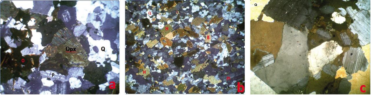Photomicrographs of charnockite from a) Akure showing Q = quartz, B = biotite, Opx = orthopyroxene, P = plagioclase, O = opaque; b) Ikere showing Q = quartz, B = biotite, Pl = plagioclase, H = Hornblendeh; and c) Ado showing Q = quartz, B = biotite, P = plagioclase, H = hornblende.