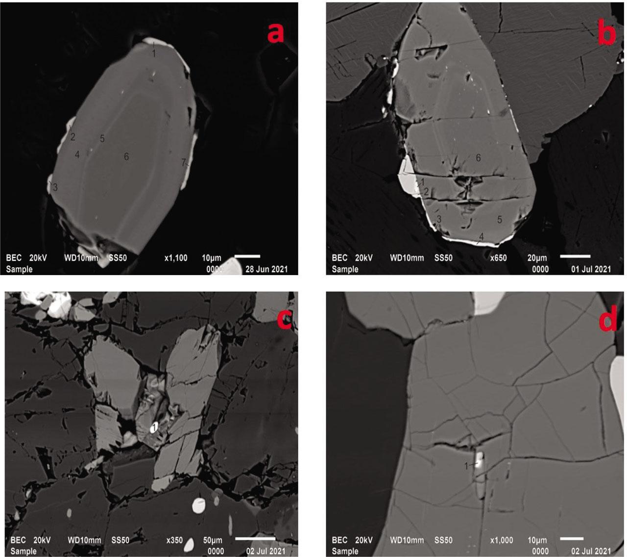 (a and b): Back-scattered electron (BSE) image of REE-bearing minerals in the rims of zoned apatite from charnockites; (c and d): BSE image of REE-bearing minerals in syenites.