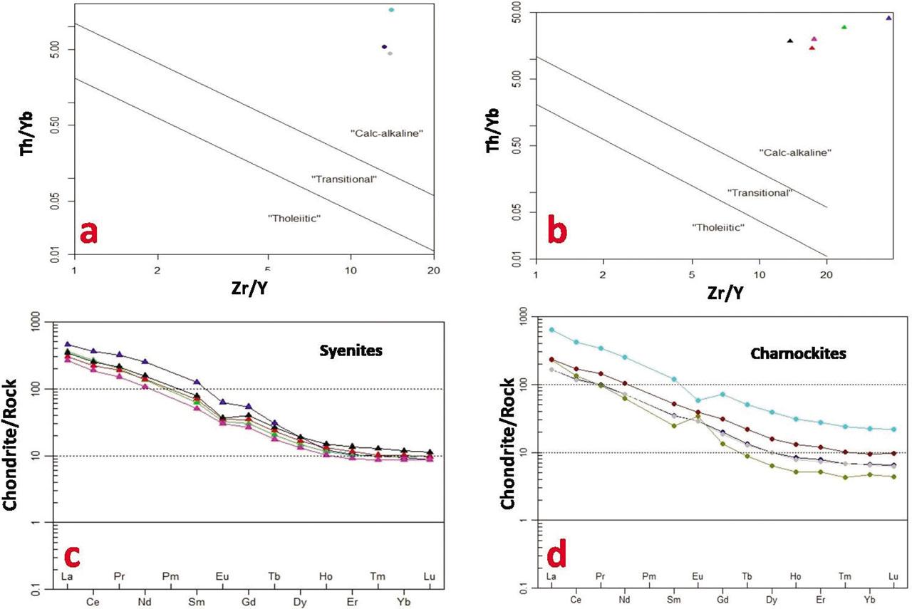 a) Plots of Zr/Y vs Th/Yb for charnockites of the study areas showing three sampling points (after Ross and Bédard [14]; b) Plots of Zr/Y vs Th/Yb for syenites of the study area (after Ross and Bédard [14]); c) Chondrite normalised REE distribution pattern for the syenites (after Boynton [13]); d) Chondrite normalised REE distribution pattern for the charnockites (after Boynton [13]).