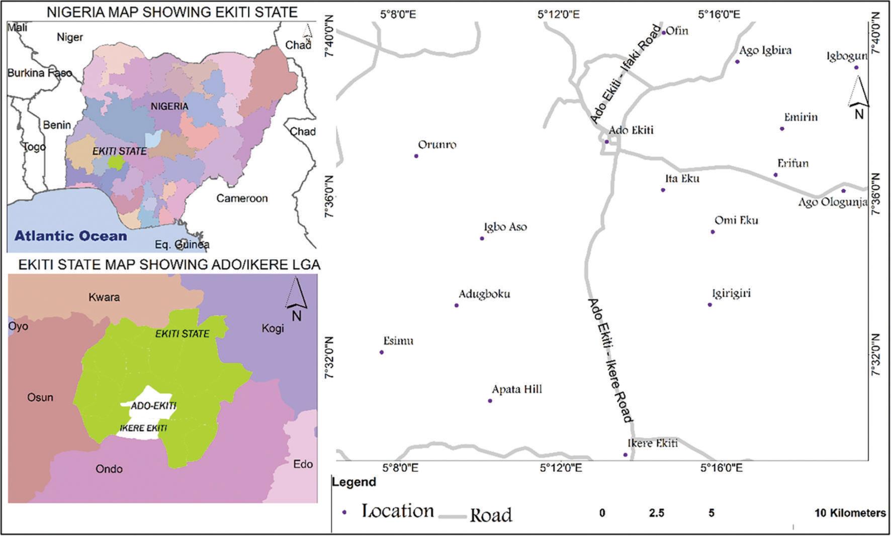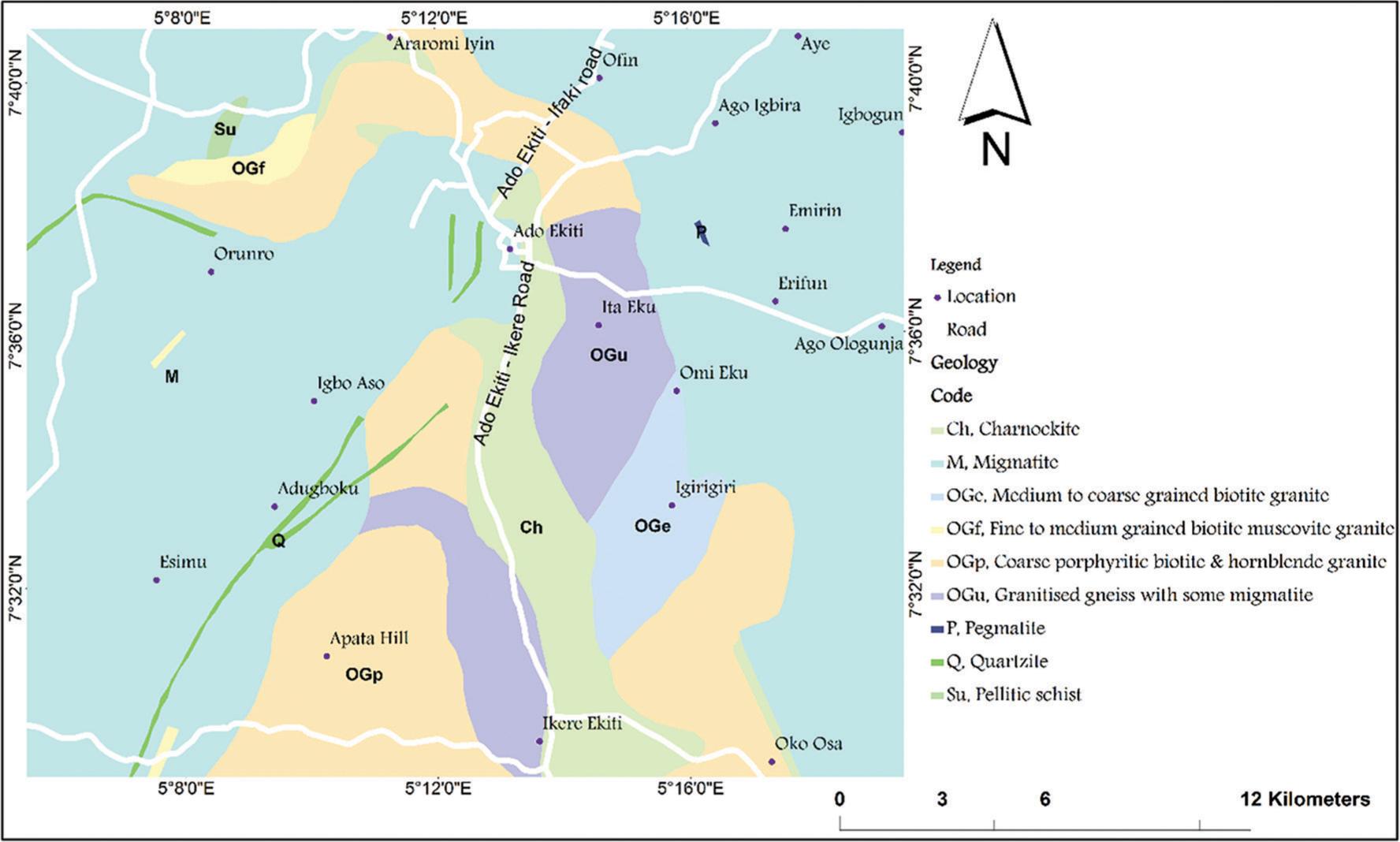 The Ado-Ikere road is the main link between Akure and Ado-Ekiti, capital towns of Ondo and Ekiti States, Nigeria, respectively (Figure 1). The area lies in the tropical rain forest with mean annual rainfall of about 1300 mm and annual mean temperature of between 18 °C and 33 °C. The study area is underlain by the Precambrian basement complex of southwestern Nigeria (Figure 2).