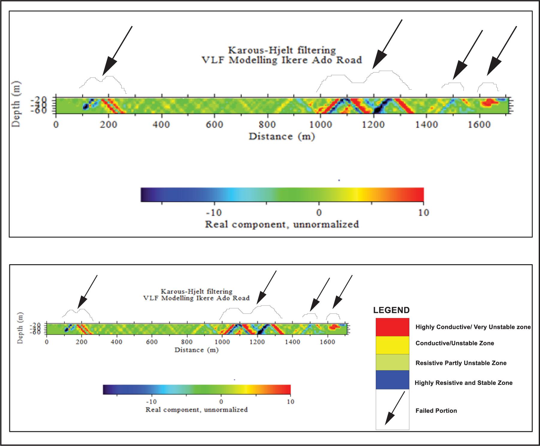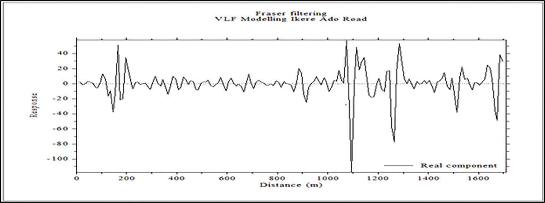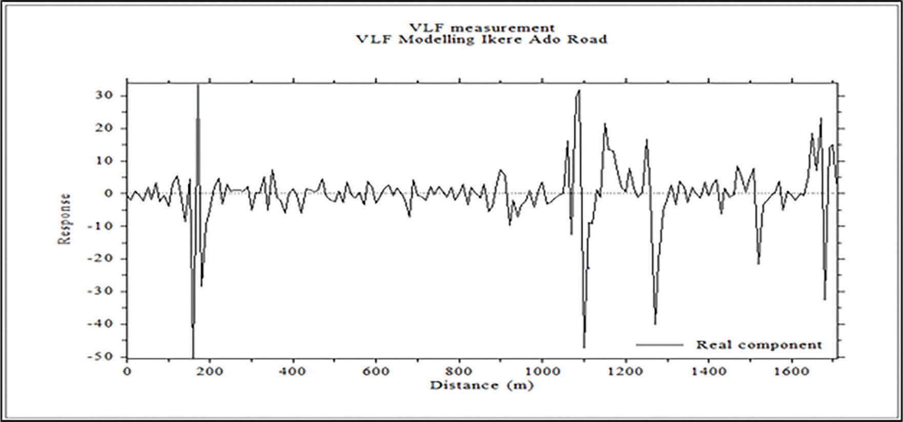 The VLF-EM data were acquired along a profile parallel to the road, covering a distance of 1710 m at a 10 m station interval. ABEM WADI electromagnetic receiver unit synchronized with the radio signal from the GBR station located in Rugby (England) operating at a frequency of 18.8 kHz was used for the survey. The equipment measured the raw real/in-phase and imaginary/quadrature components of the vertical to horizontal magnetic field ratio on the field. An in-built filtering program provided by the equipment and a software package KHFfilt Version 1.0 enabled the conversion of the raw real data into filtered real data in which anomaly inflections appear as peak positive anomalies and false VLF anomaly inflections as negative anomalies of the profile. VLF-EM 2D Inversion model was prepared following the application of Fraser Filtering and Karous-Hjelt Filtering [19]. The VLF-EM mapping was particularly deployed to isolate subsoil conductive zones and linear structures of geological importance.
