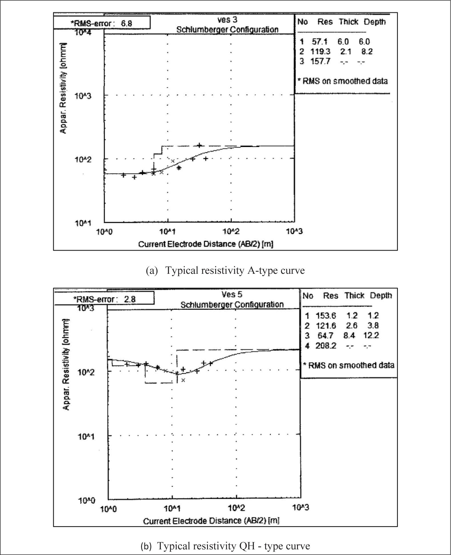 The H-type curve predominates the area of study. A stratigraphic sequence comprising the topsoil whose composition is variable alluvium, sand, lateritic clay or clay followed by clay/ sandy clay and the bedrock corresponds to the H-type curve. The bedrock could be weathered or possibly fractured basement. The intermediate layer is characterized by low resistivity. It is commonly water-saturated. The A-type curve presents subsurface conditions in which there is a persistent increase in the layer resistivity values from the topsoil to the basement rock (ρ1 < ρ2 < ρ3). It suggests increasing subsoil strength and integrity [3, 9, 11].
