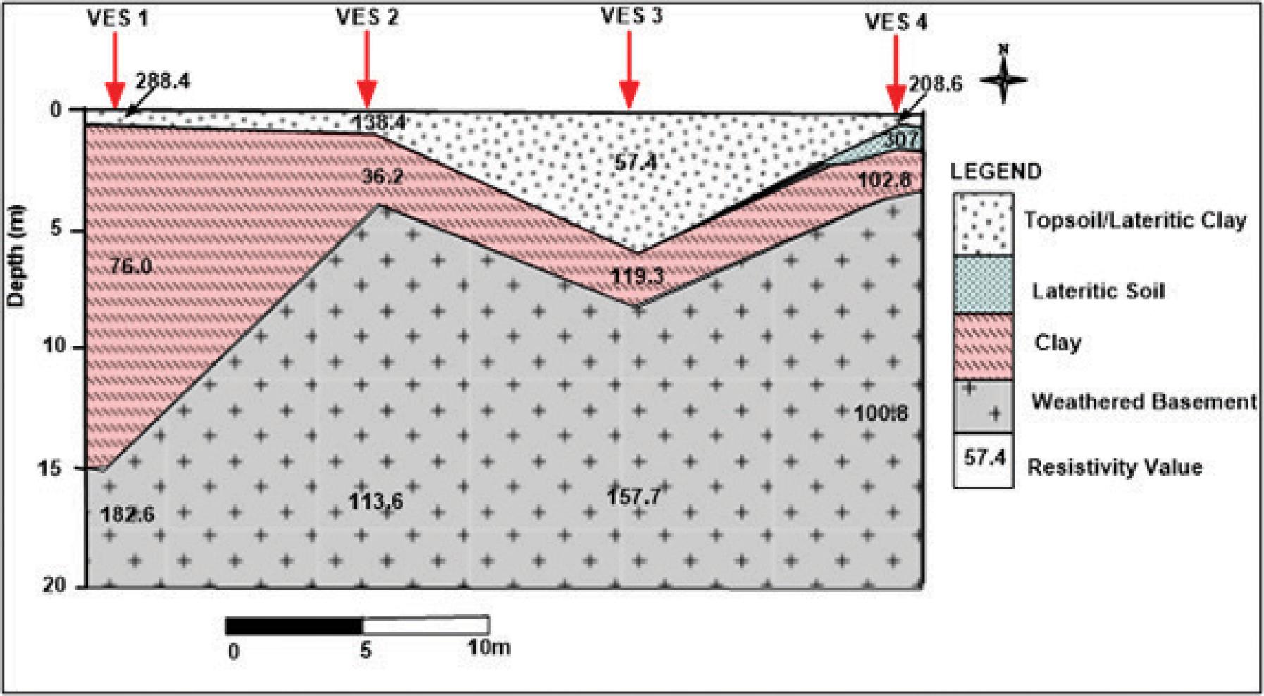 The weathered/fractured basement is revealed at varying depths ranging from 4.0 to 15.0 m with a resistivity spectrum of 100.8 to 182.6 Ωm. This affirms a system of linear geological structures prescribed by the VLF-EM profile. The generally low resistivity values indicate low bearing capacity. Transmitting load to this layer may induce differential settlement of the pavement structure and precipitate failure [3, 7, 9].