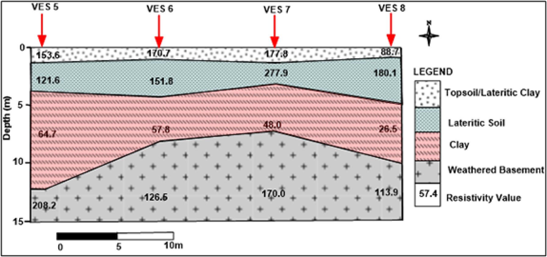 The third geoelectric layer, a clay/clayey horizon extending to a depth of about 12.5 m at VES 5 is geotechnically significant. The layer resistivity values ranging from 26.5 to 64.7 Ωm indicate varying degrees of saturation owing to capillary effect. The material in place lacks a basic requirement of sub-base course to facilitate the drainage of free water that may accumulate below the pavement. Clayey formations are prone to differential settlement under prolonged vehicular traffic/axle loading owing to high porosity and practically little or no permeability [5, 21]. This fragile layer is underlain by a weathered/fractured basement with resistivity values ranging from 113.9 to 208.2 Ωm. The degree of weathering and fracturing permits groundwater accumulation and the effect of rising water table. The bearing capacity of the layer is corresponding low [3, 16, 20].
