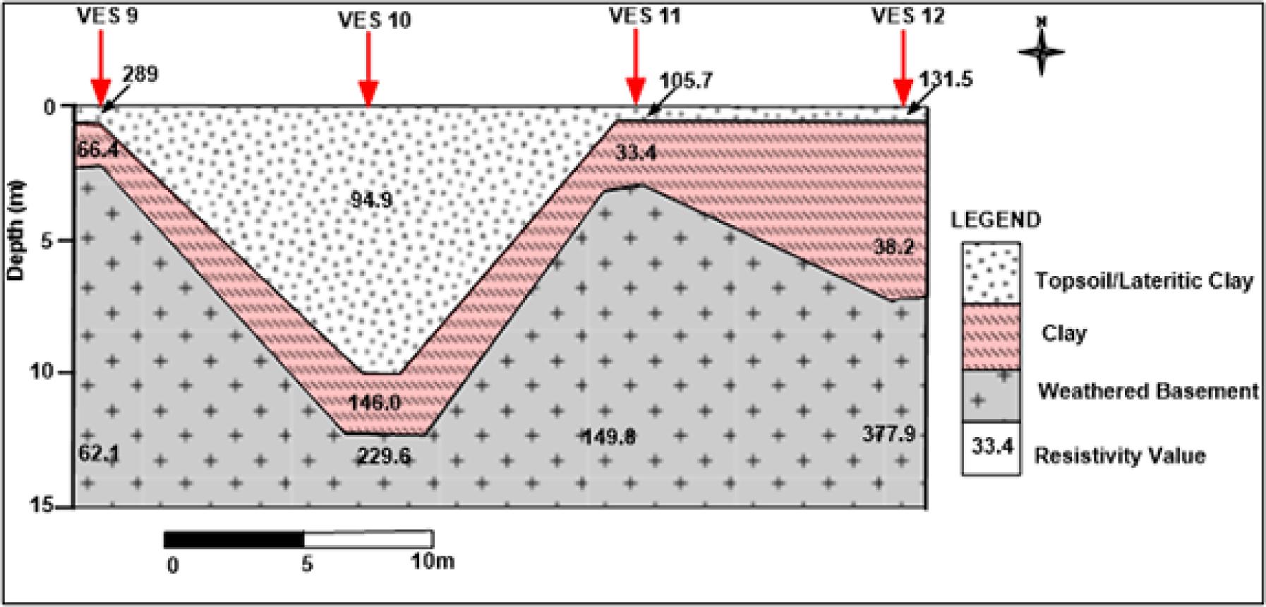 The geoelectric section of segment III encompassing VES 9 to 12 presents a 3-layer geoelectric succession (Figure 10). The resistivity of the topsoil ranges from 94.4 to 289 Ωm; indicating materials of varying clay contents, with thickness varying from 0.4 to 9.9 m. The generally thin layer is delimited by a massive clayey material (resistivity of 94.9 Ωm) stretching from VES 9 to VES 11 and extending to 9.9 m at VES 10. It is underlaid by a clayey substratum with resistivity value as low as 33.4 Ωm at a depth of 0.9 m around VES 11.