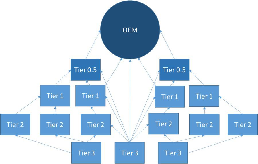 The OEM’s ecosystem consists of a hierarchical network of suppliers. Traditionally, first-tier (Tier 1) suppliers are direct suppliers of vehicle components to OEM; second-tier (Tier 2) suppliers are suppliers to Tier 1, and third-tier (Tier 3) suppliers supply raw materials to Tier 1, Tier 2 or OEM. Over time, due to the expansion of automotive markets in Europe and the US, some of the first-tier suppliers evolved into so-called mega-suppliers (Tier 0.5), taking over full design and market research and logistical integration of comprehensive modules for OEMs (Wang 2014; Volgina 2011).