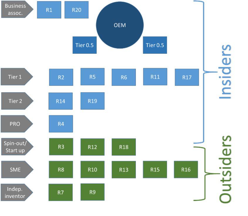 Respondents that are integrated into the OEMs’ innovation ecosystems may be called ‘Insiders’ while the respondents who are (successfully or unsuccessfully) trying to push their inventions into the system are ‘Outsiders’.