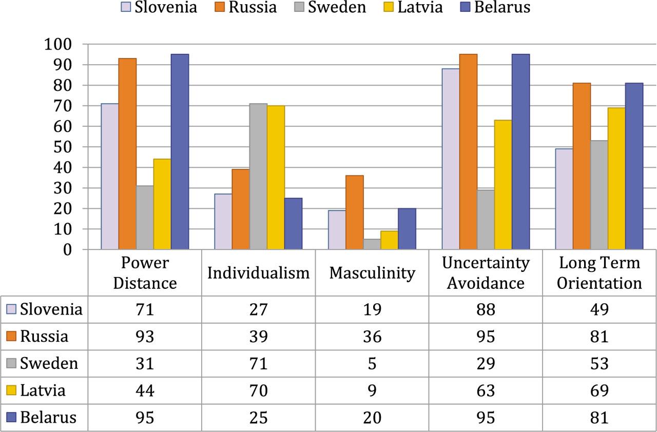 According to the model of national culture differences by Fons Trompenaars and Charles Hampden-Turner, studied cultures might be divided into universalistic (Latvia, Sweden) and particularistic (Slovenia, Russia, Belarus) cultures regarding the attitude towards rules (Trompenaars and Hampden-Turner 2011).