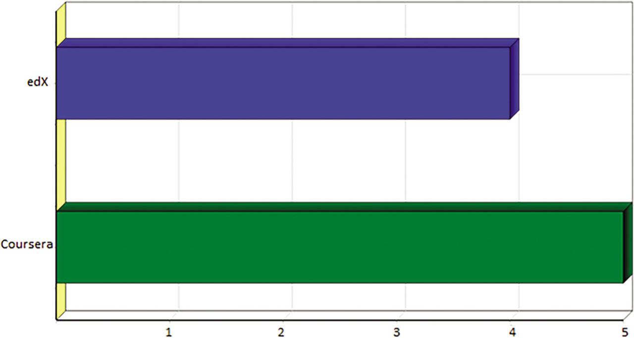 Table 1 and Figure 2 show that Coursera online platform is a better choice according to the selected criteria. In particular, it is more affordable and offers more options for course selection (types of courses and level of difficulty). Compared to the edX online platform, specialisation is also available in Coursera. Coursera can also be followed in several languages.
