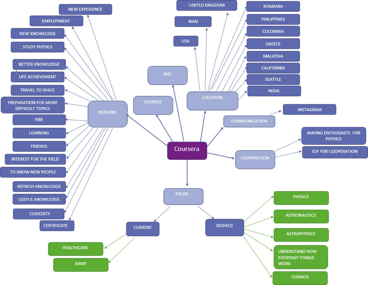 The model shows the following topics that appear among the comments in the course forum: communication, course, cooperation, preferred field of activity, the current field of activity, age and reasons for attending the course. Reasons for signing up for the course are new challenges, planetary flyby, better knowledge in the field, company of people, desire to be an astrophysicist, passion for the field, free course, new learning, increased interest in the field, desire to explore the field, getting a job, passion for rockets and interacting with new people.