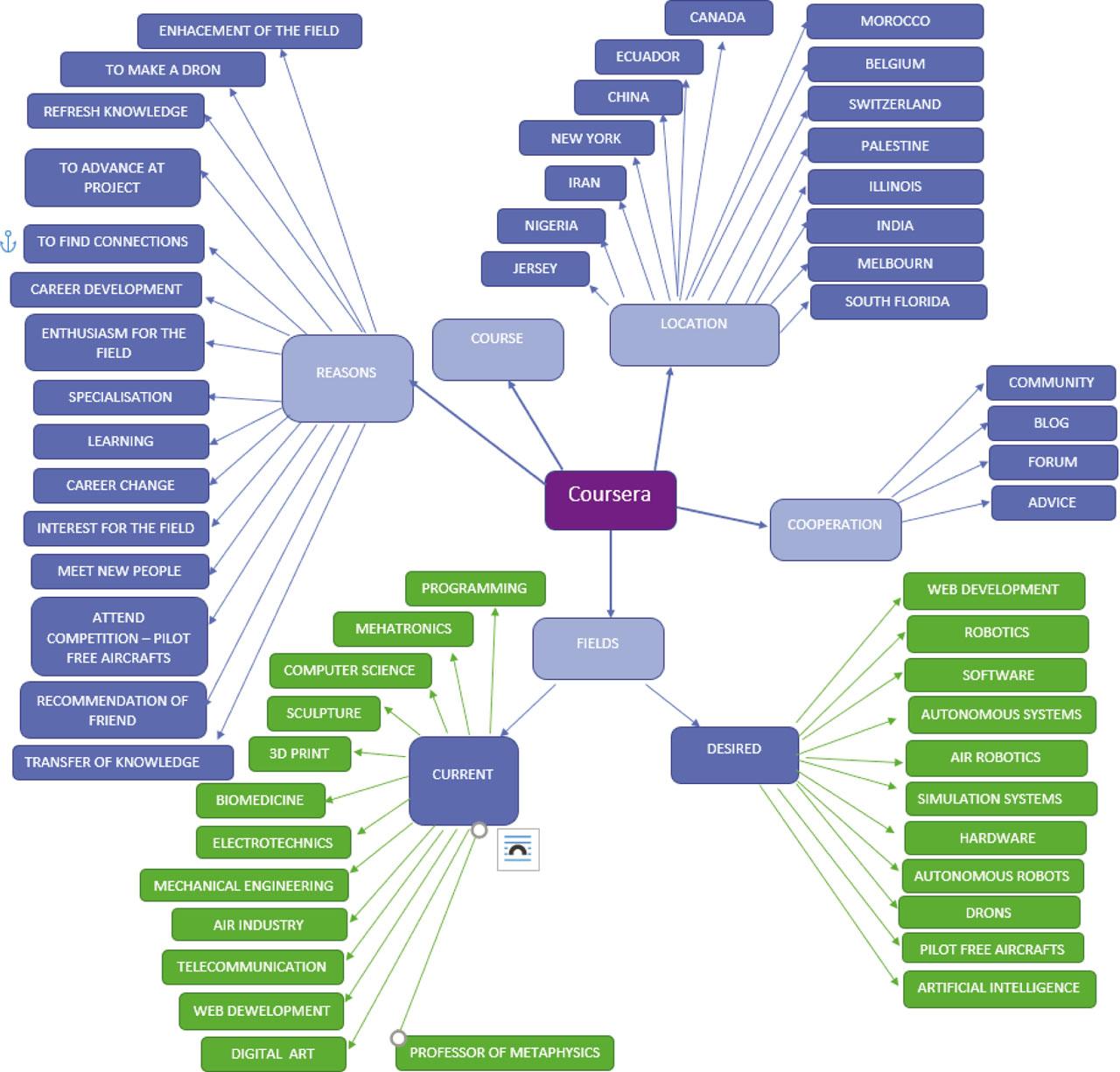 To summarise the results of the netnography, we found that for the free course on the Coursera online platform, the main reasons given by participants were to acquire new knowledge and to express interest in the chosen field. We also observed a desire to meet new people. For the paid course, we found a greater focus on career change or on career development and, thus, knowledge specialisation, refreshment, advancement, etc. There was also greater attention to communication and making connections.