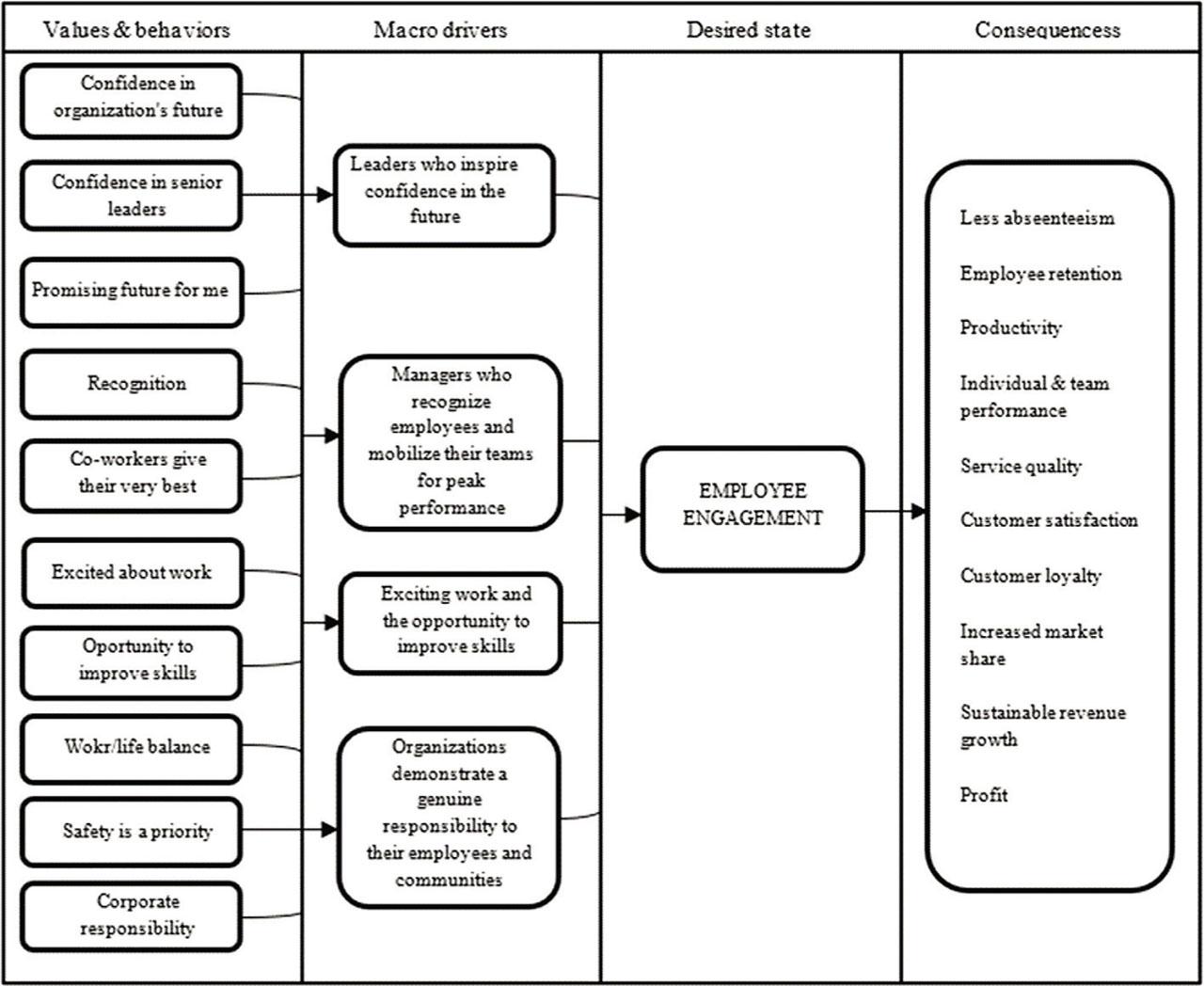 The model is composed of four areas: values and behaviours, macro drivers, desired state, and consequences. The above-proposed drivers can be found in the part values and behaviours. In the second part, those drivers are migrated and mapped to the area of macro drivers. Management of these drivers leads to the third stage of the framework (desired sate), which is employee engagement. Metrics such as profit or sustainable revenue, which are better with the higher level of engagement, can be found in the last part (consequences), and correlation has been found among these metrics and engagement.