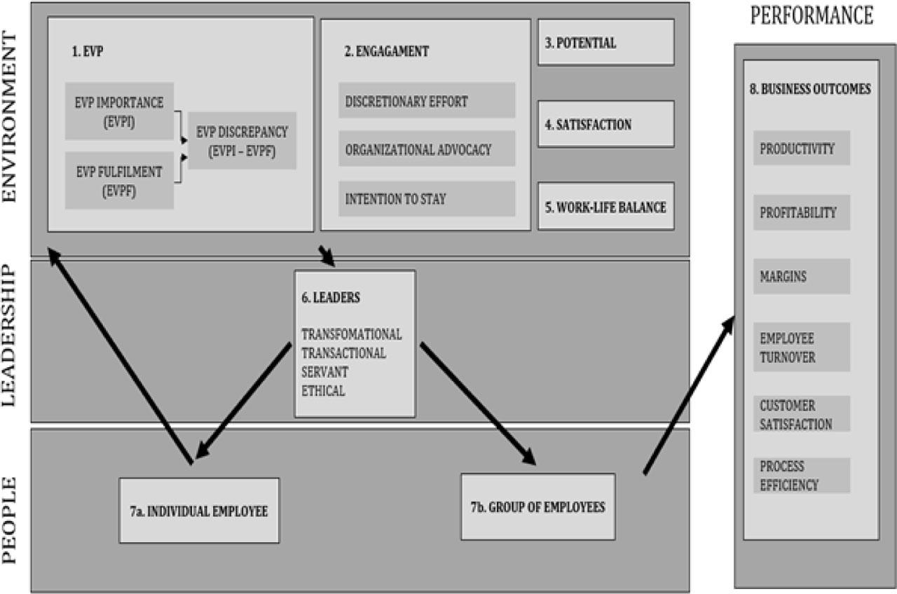 The proposed framework comprehensively describes the connection between EVP and engagement, and consequently their joint impact on the business results.