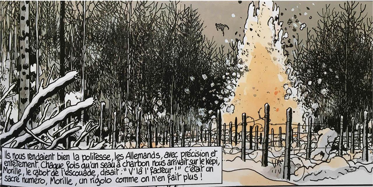 Les BD prennent rétrospectivement position contre la guerre, ce qui est illustré, par exemple, par l’assimilation des tranchées à des tombes (Tardi / Verney 2014 : 20), par le parallélisme entre le « sacrifice collectif librement consenti » avec la guerre (ibid. : 11) ou encore par la similarité des soldats allemands et français : « C’était la première fois qu’on pouvait reluquer de près nos ennemis… Ils nous ressemblaient, en somme » (ibid. : 7).