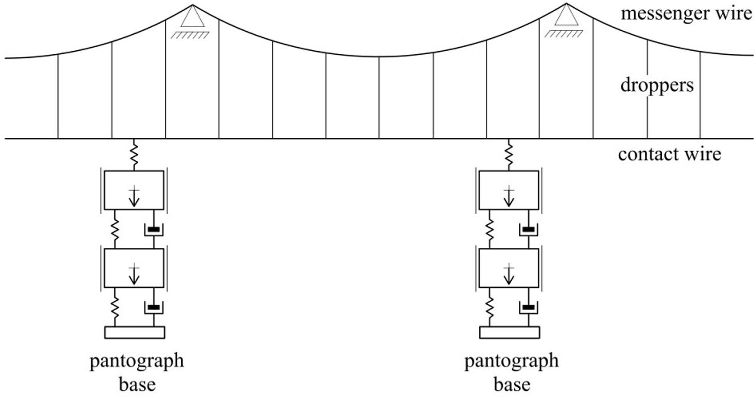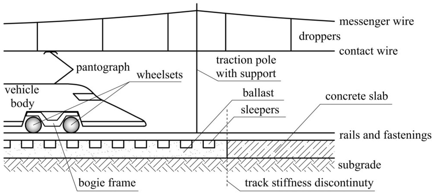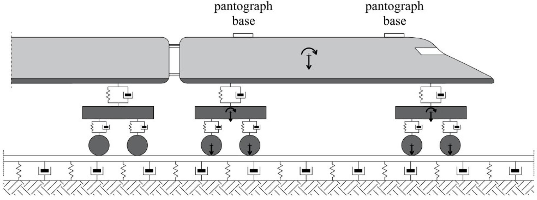 Along with the development of high-speed railways, a lot of articles on the dynamics of railway system structural elements appeared in the literature. Many of those articles are devoted to computational methods for simulating coupled vibrations of the track–train system [1,2,3] as well as the vibrations of catenary–pantograph system [4,5,6]. However, while there is an extensive literature coverage treating both systems separately, the research on the whole railway system covering the flexible track with the moving train together with the catenary is poorly developed. This results mainly from difficulties in modeling such complicated system, accounting for the dynamic interaction at the contact between railway vehicle and infrastructure. In the case of high-speed trains, this contact occurs in two groups of places: between vehicle wheels and rails and between collector heads of pantographs and the contact wire of catenary. As it is stated by Ambrósio et al. and Pombo et al. [7,8,9], the dynamic phenomena occurring at these places become more and more significant with the growing speed of trains. They influence the operational conditions of high-speed railways – especially the quality of current collection through the catenary–pantograph interface. There are many articles dealing with an analysis of dynamic interaction between the pantograph and catenary because it allows to evaluate the quality of current collection by the numerical prognosis of the number of loss of contact events [4,5,6,7, 10]. However, in a great majority, their authors assume that the pantograph base is immovable in a vertical direction, although in reality, it undergoes vertical vibrations as part of a running vehicle. It is difficult to find an article where an impact of vehicle vibration on the pantograph–catenary dynamic interaction is considered. The article by Pombo and Ambrosio [11] is an exception, but it considers only one scenario, in which the vehicle vibrations are induced by geometrical irregularities of rails, measured experimentally. Considering that in the case of high-speed railways the rails are of really good quality, their irregularities can induce only slight vehicle vibrations which have a negligible effect on the catenary.