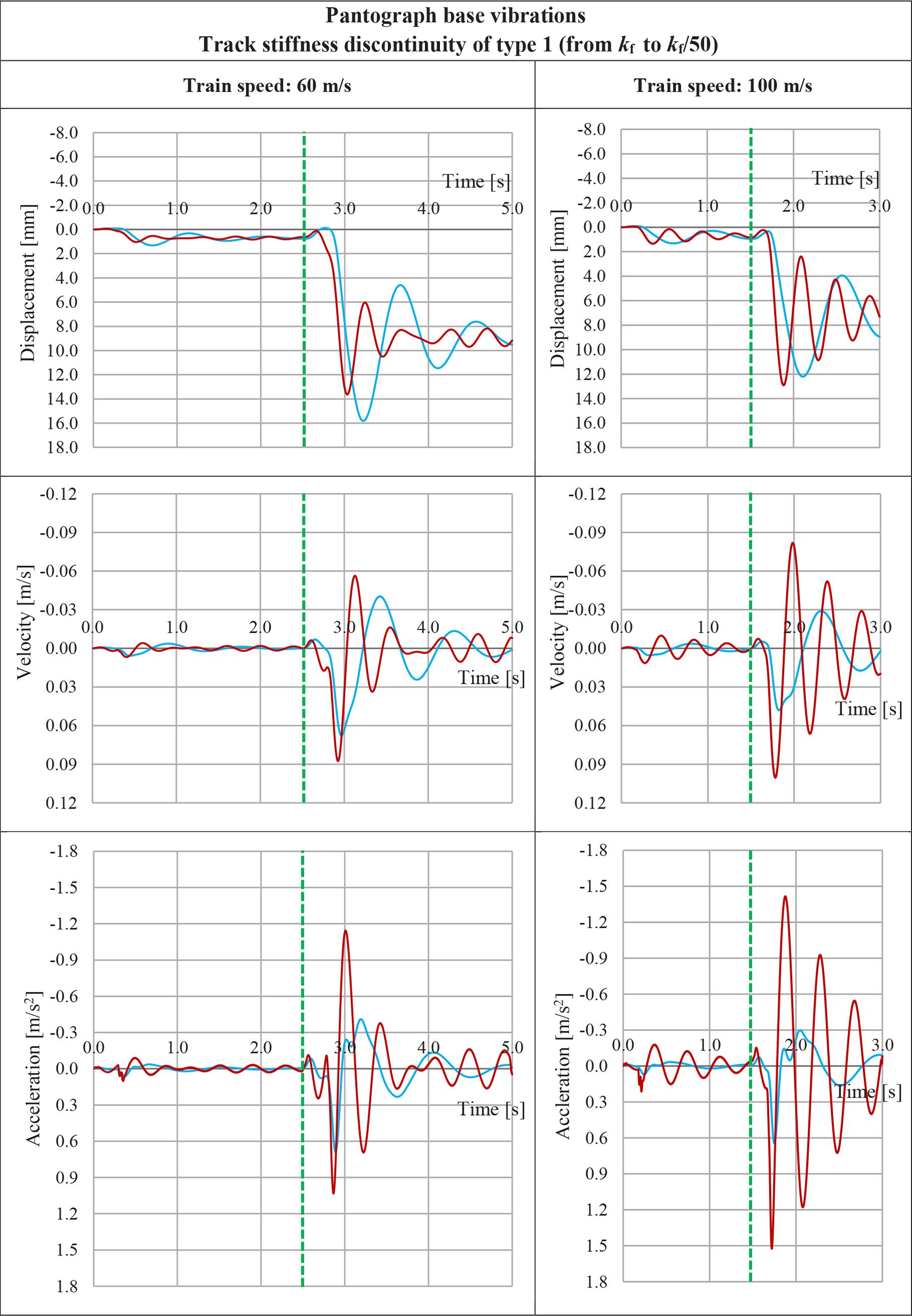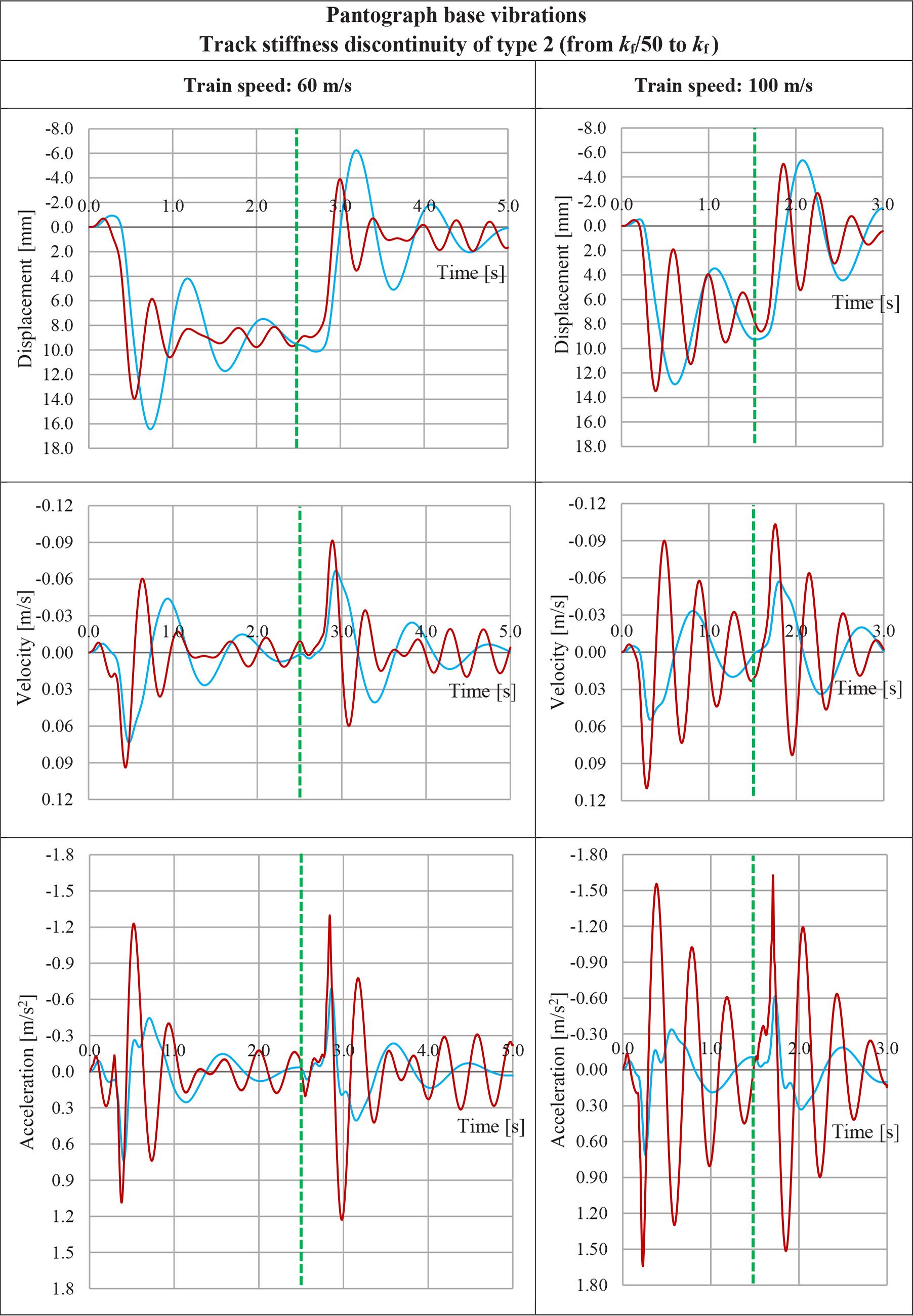 Simulation results of vehicle body vibrations at the point of pantograph base attachment are shown in Fig. 5 (for the track stiffness discontinuity of type 1) and Fig. 6 (for the track stiffness discontinuity of type 2). Time histories of displacement, velocity, and acceleration are presented for two cases of vehicle suspension (two-stage and single-stage suspension). The graphs on the left side relate to the passage speed of 60 m/s, those on the right side – 100 m/s. These graphs are prepared on the same vertical scale for both speeds, in order to facilitate a comparison of the obtained results. Similarly, time axes are equally scaled for both speeds, so that the time nature of vibrations can be compared. A vertical dotted green line denotes the moment of passing through the track stiffness discontinuity.