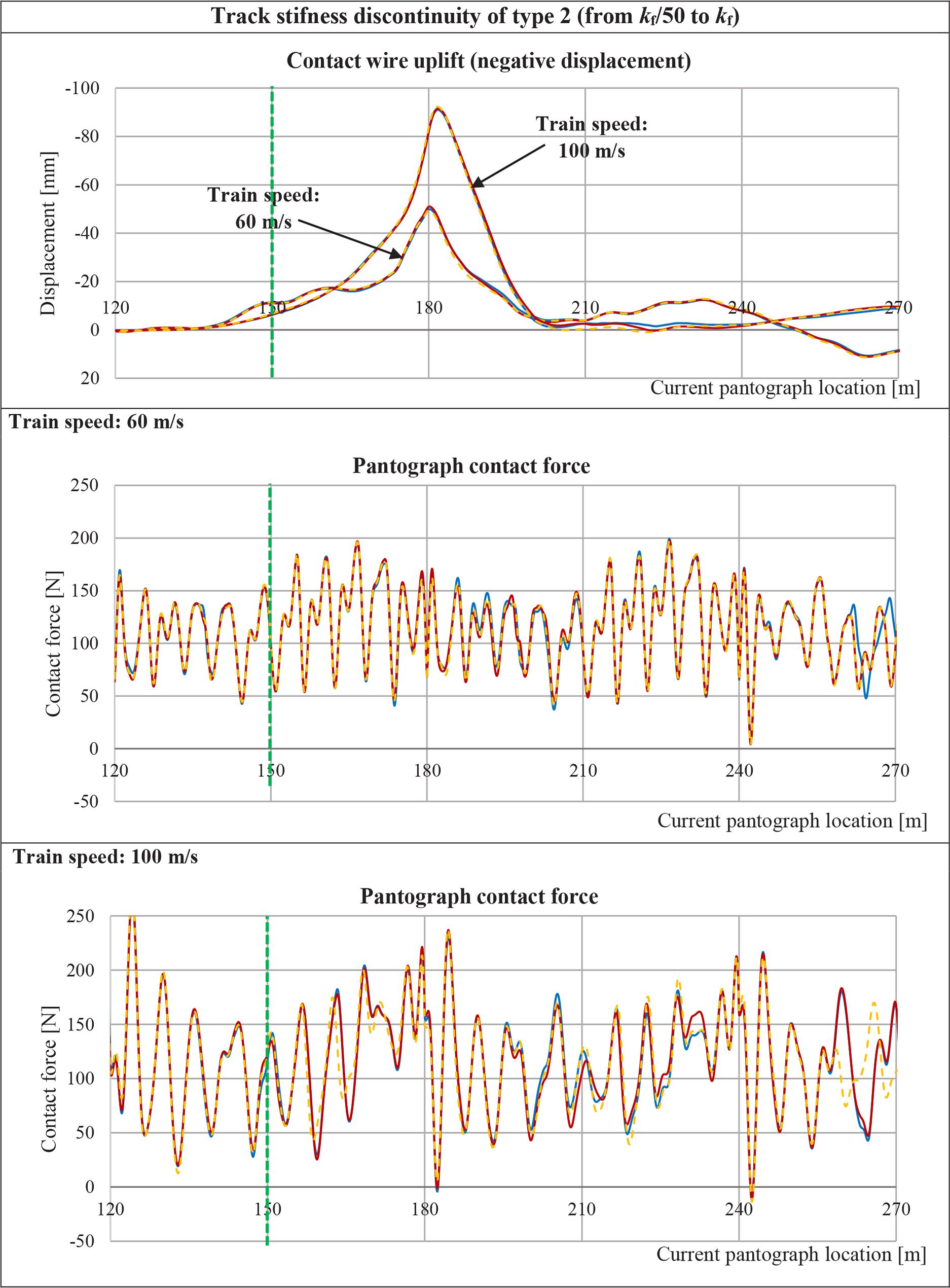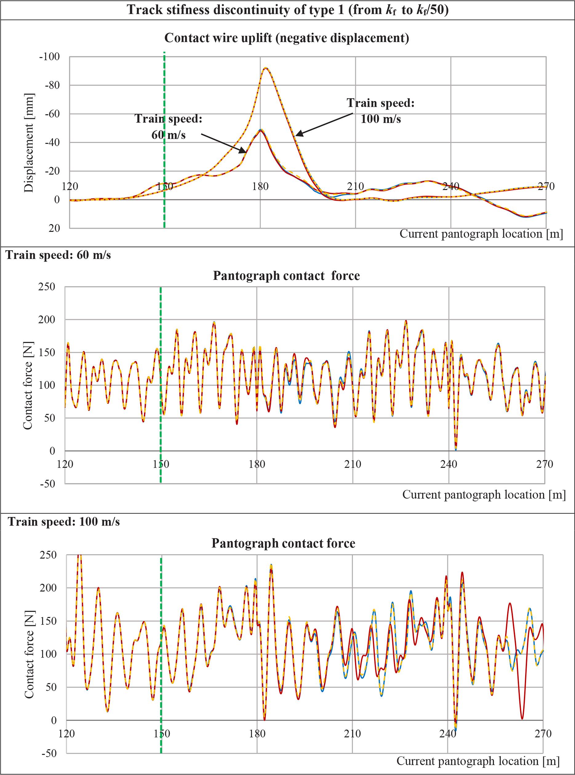 The obtained results demonstrate that the vehicle body vibrations induced by crossing the track stiffness discontinuity do not considerably influence the catenary vibrations. Differences between time histories of the contact wire uplift are almost unnoticeable. In case of the dynamic contact force, the influence of vehicle body vibrations is more noticeable, but it is relevant only in one-load scenario, in which the train without the secondary suspension passes the track stiffness discontinuity of type 1 at the speed of 100 m/s (Fig. 8). Under these conditions, an additional peak of the contact force oscillation is observed in the last phase of the pantograph run (from 240 m to 270 m), which leads to a strong local decrease in the contact force and thus to loss of contact (the loss of contact occurs when the contact force is zero or negative). It means that the railway vehicle vibrations might increase the probability of loss of contact between pantograph head and contact wire, but the two-stage suspension used in high-speed trains effectively prevents such incidents.