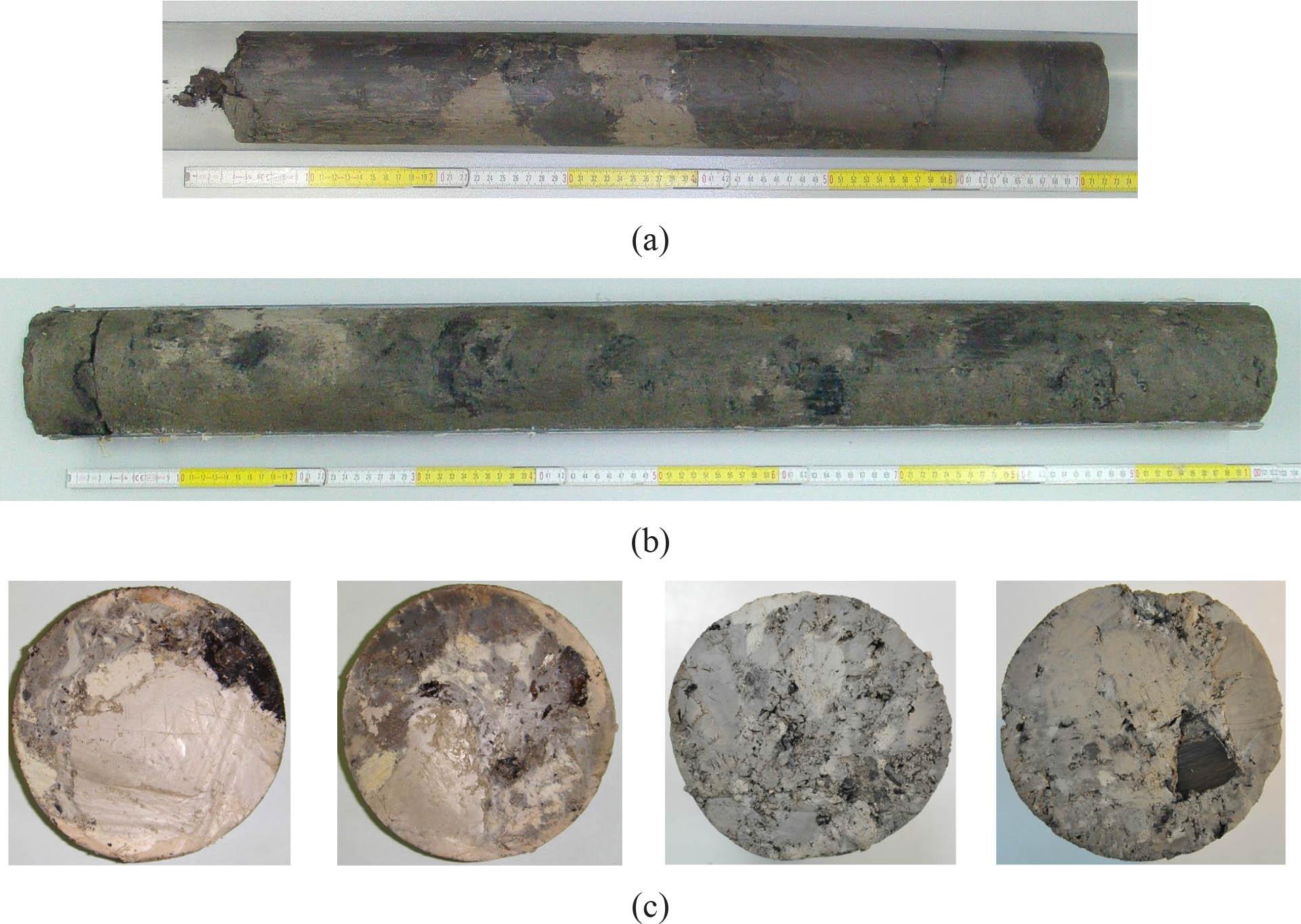 View of the dump soil samples: (a) after extracting from Shelby tube (∅ ∅70 mm), (b) after extracting from PVC tube (∅ ∅100 mm) and (c) cross sections.
