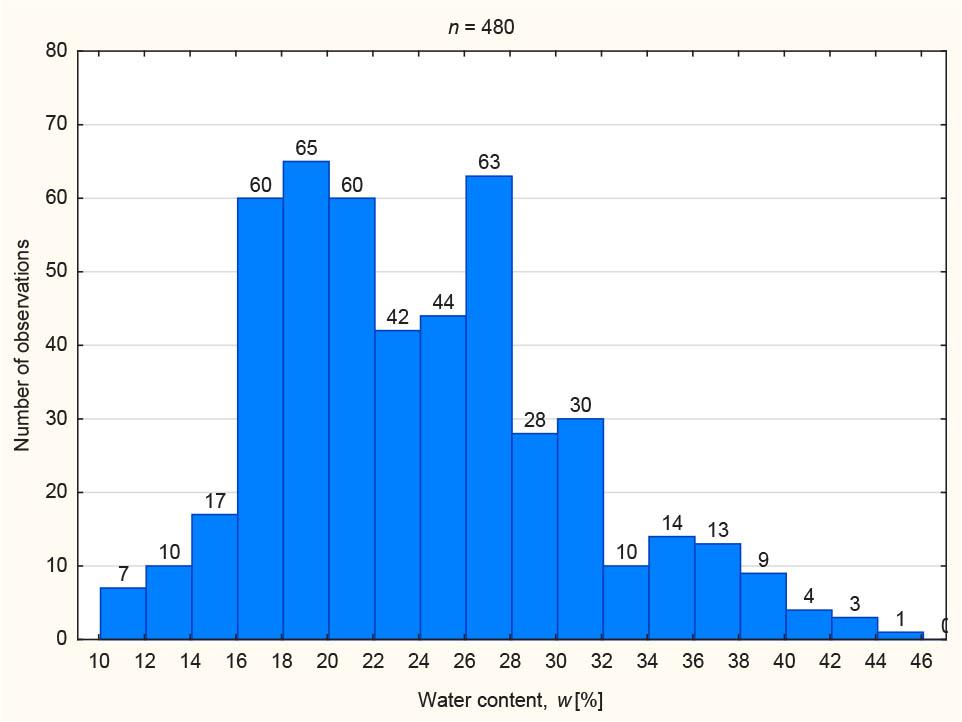 The majority of the tested material had a stiff consistency (51.2%). The percentage share of soils with firm consistency was 21.9%, very stiff consistency 17.5% and soft consistency 9.4%.