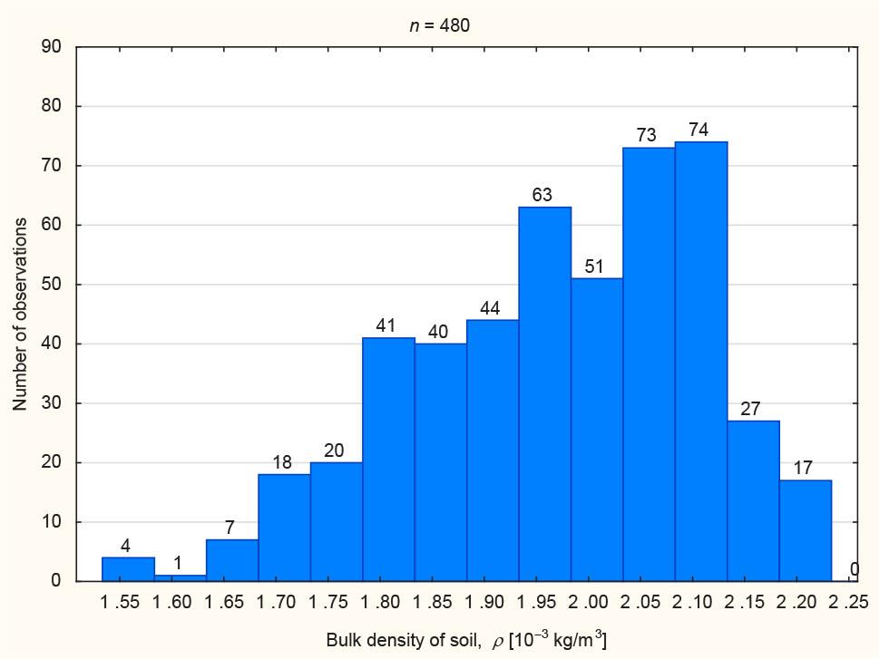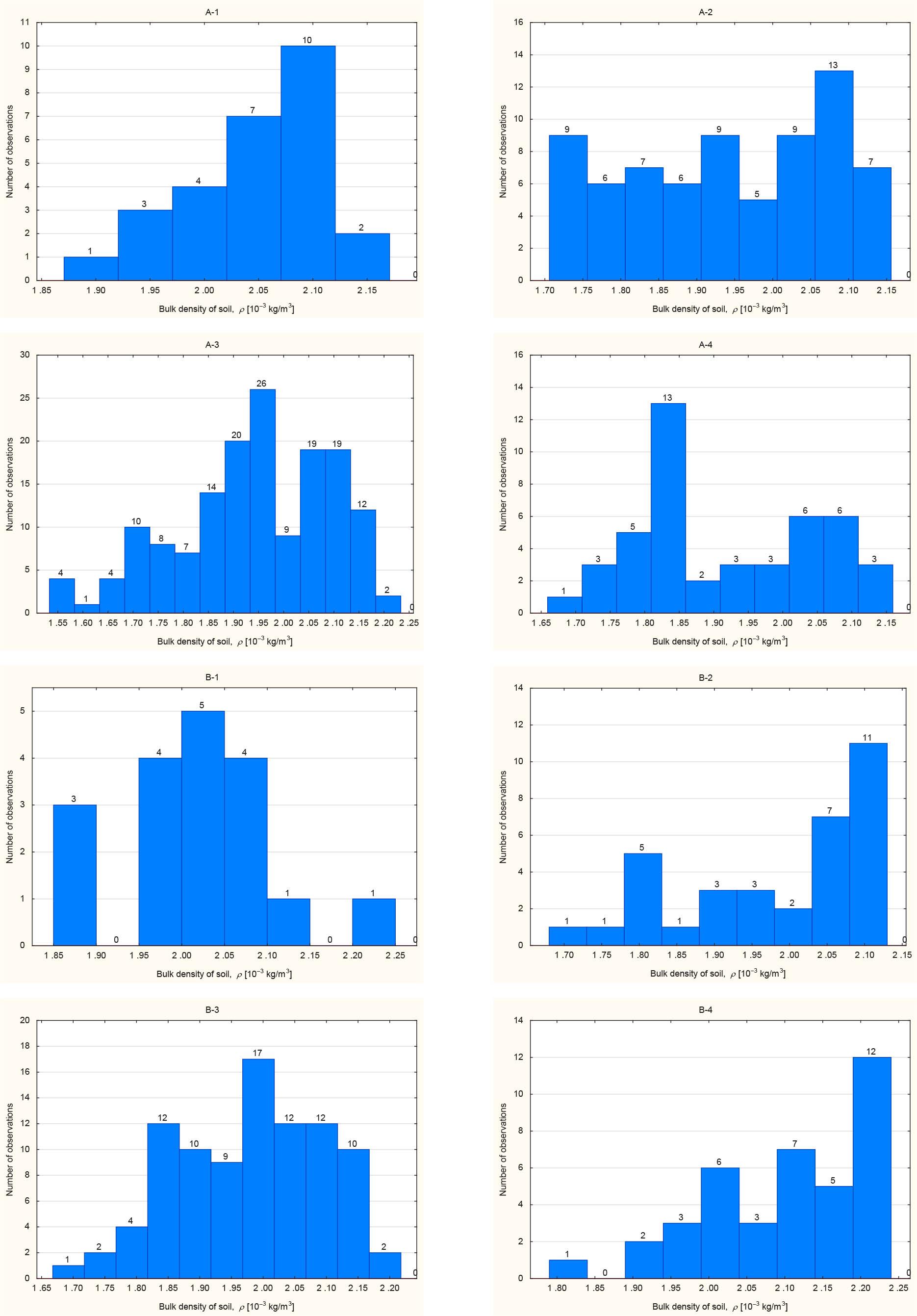Histograms of bulk density distribution of the dump soil in particular groups.
