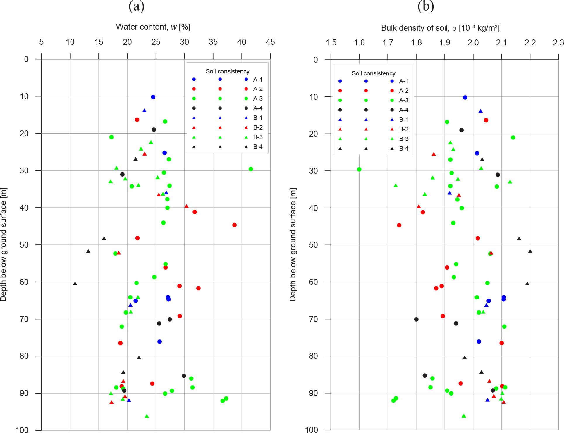 The variability of the water content of the dump soils is random and does not depend on depth (Fig. 6a). Therefore, it should be assumed that bulk density will increase with depth. Unfortunately, this is not reflected in the results obtained (Fig. 6b). The variability of the consistency of the dump soils is random as well and does not depend on depth (Fig. 6). This random variability is observed both in individual boreholes and in the entire population. However, there is a clear correlation between an increase in bulk density and a decrease in water content of the dump soils (Fig. 7).