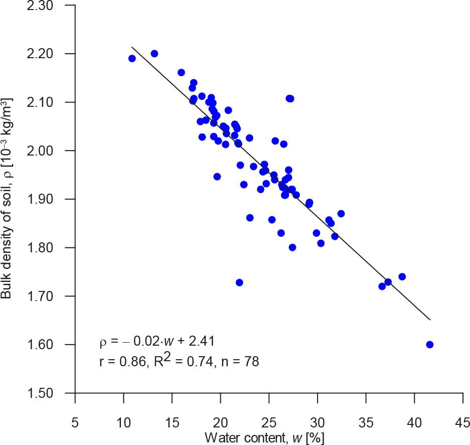 The water content and bulk density of dump soils are very heterogeneous. They are related not only to the varied composition and consistency of the soil but also to the random content of organic material (lignite). The heterogeneity of water content and bulk density is observed in the whole population as well as in individual separated groups of dump soils. Particles of organic material accidentally contained in the soil overestimated the water content and underestimated the bulk density of the soil samples. Probably, that is why the changes in the consistency of the dump soil are not accompanied by a clear change in its water content. However, there is a clear correlation between an increase in the bulk density and a decrease in the water content of the dump soils.