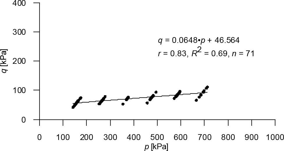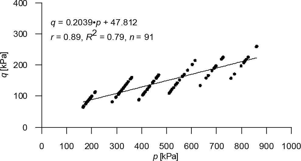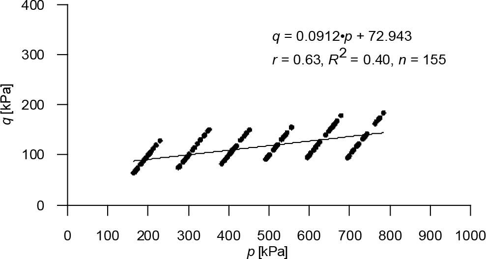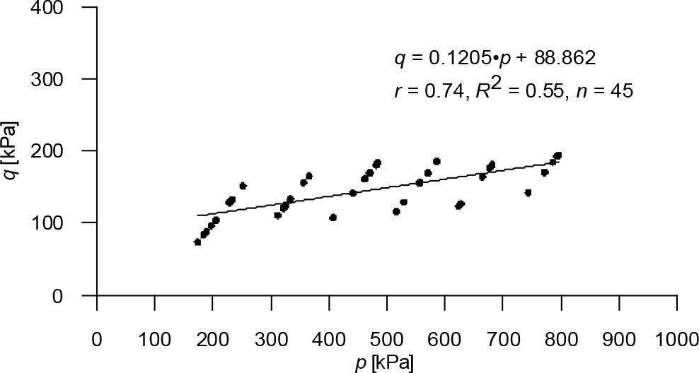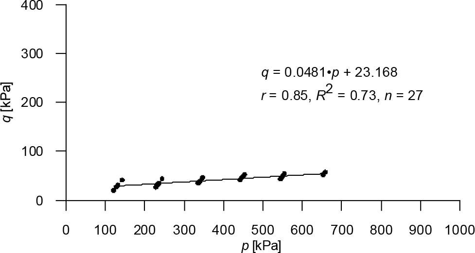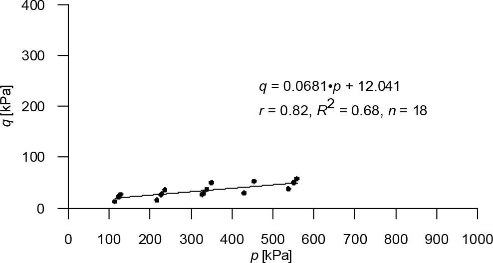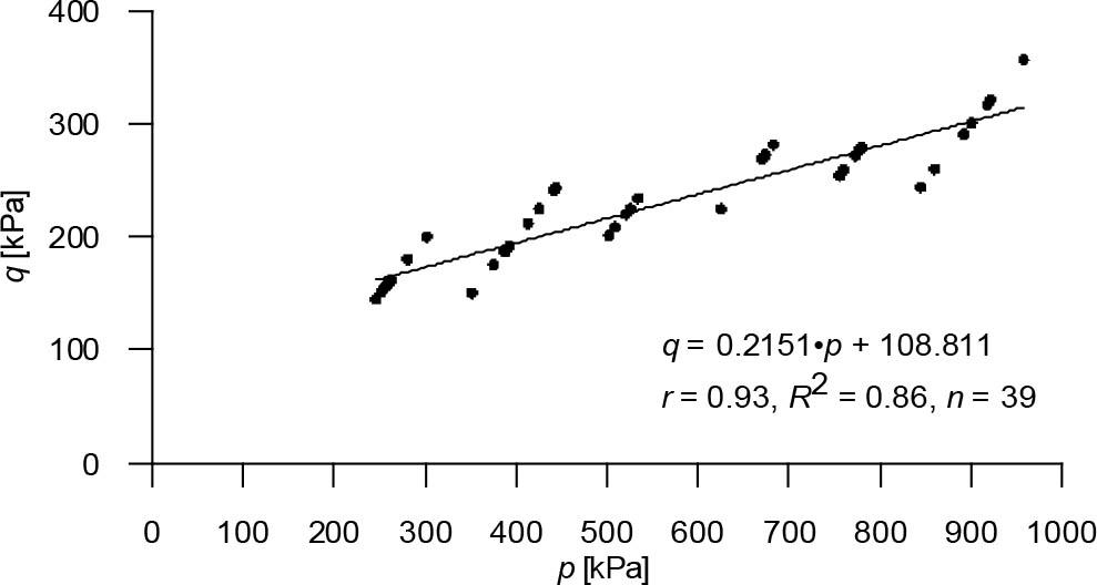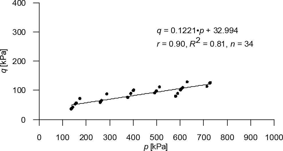 The strength parameters of the tested soils were calculated using the equation (Das, 2008): q = m + p · tan α, where