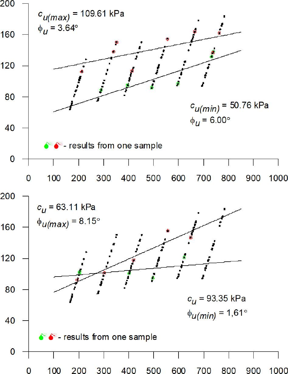 The obtained results characterise well the average values of the selected mechanical properties of the dump soil divided into type and consistency of the soil. However, in most cases, the disparity of results of cohesion and angle of internal friction is large (Table 4). The large dispersion of results is mainly due to the heterogeneity of the dump soil. Considerable differences in real shear strength should be taken into account for particular samples classified in the same group of dump soils – for example, group A-3 (Fig. 20): cu(min) = 50.76 kPa, cu(max) = 109.61 kPa, ϕu(min) = 1.61° and ϕu(max) = 8.15°.