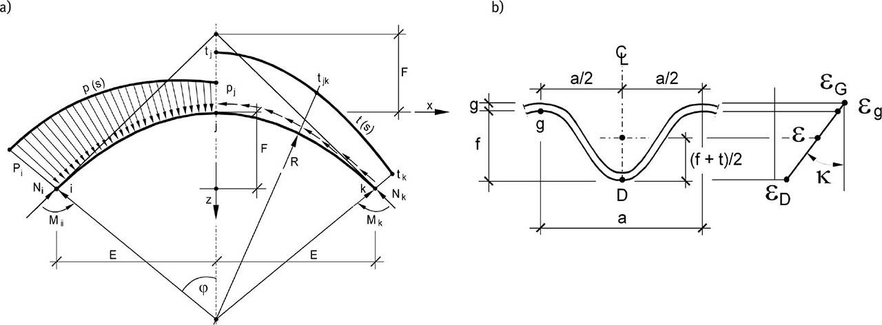 Equation (1) contains the geometry of the corrugated metal sheet, as can be seen in Figure 4b. In order to determine the change in curvature κ and the radius of curvature of the shell ρ, the geometrical relationships of the sheet and also εD and εg can be used. The bending moment can be then determined as follows: