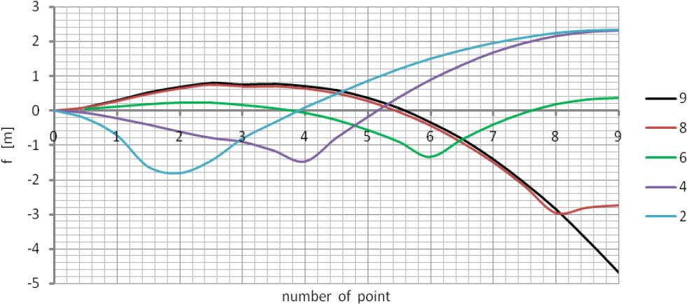 The measurement results from the construction of the Shumal Bridge facility in Ras Al Khajmah near Dubai are presented below [30]. This facility currently has a record span. The geometrical characteristics of its shell, as can be seen in Figure 4, involve its shape in the form of circular sections with a radius of curvature R = 29.68 m and in the corner Rn = 8.39 m. This shell has a span L = 32.39 m and a height H = 9.57 m. The geometry of the corrugated metal sheet is included in its technical designation UC 500 × 237 × 12. During construction, and during monitoring of the object, strain gauge and geodetic measurements were carried out in the same points as in the Ostróda object (given in Fig. 3). Figure 13 presents the diagrams of displacements in the direction of the radius of curvature in the circumferential band, which were obtained from geodetic measurements [30]. On the horizontal axis, the markings of measuring points were adopted from Figure 4.
