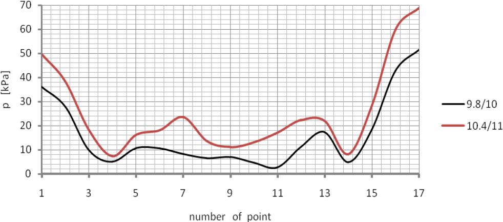 From the formulation of the system of equations (12), it is possible to solve this system (when matrix F is not singular), i.e. it is possible to determine the elements of vector p. Therefore, when in the study, and in the shell’s geometry (as in Fig. 3), there are n = 17 points in which strain gauge measurements were carried out, it is possible to obtain 17 values of loads, as in Figure 9a or b. In the algorithm that was presented earlier, soil interactions with bending moments occurring in the object, i.e. the 3D system, were connected through dependencies that occurred in the 2D model of the object in the form of an influence function. It is assumed in the calculations that the real soil impact on the shell p(s) is approximated in the form of pj values that are included in vector p (13). Due to simplifications, dispersed pj values are obtained from the system of equations (12). They do not correspond to the forms of function p(s), which are shown in Figure 7. Therefore, the algorithm in the form of the system of equations (12), which was presented earlier, is ineffective.