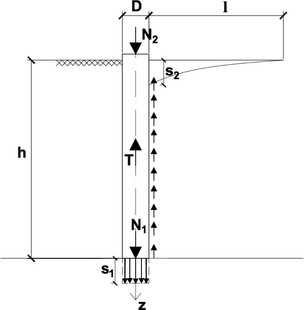 The last value which remains to be calculated is τ1, namely, shear stress at the depth of the pile base, which is a reaction on τ2(N2) pile settlement. As above, τ1 is obtained with (21).