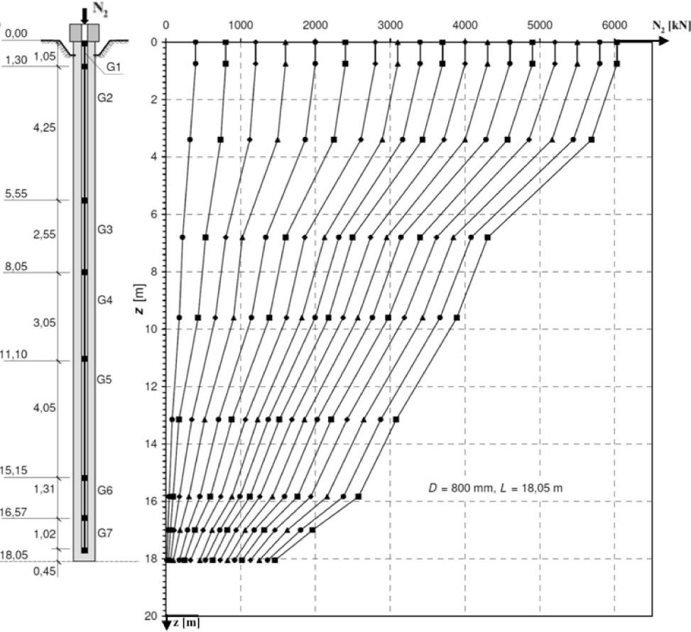 Fig. 2 presents the results of a set of extensometers for one of the analysed piles: