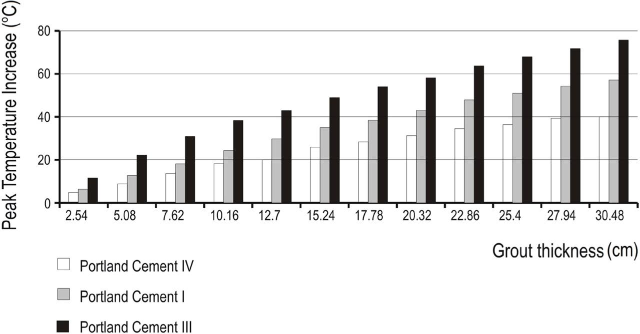The increase in peak temperature at the casing–grout boundary as a function of grout thickness for three different types of Portland cement grout [16].