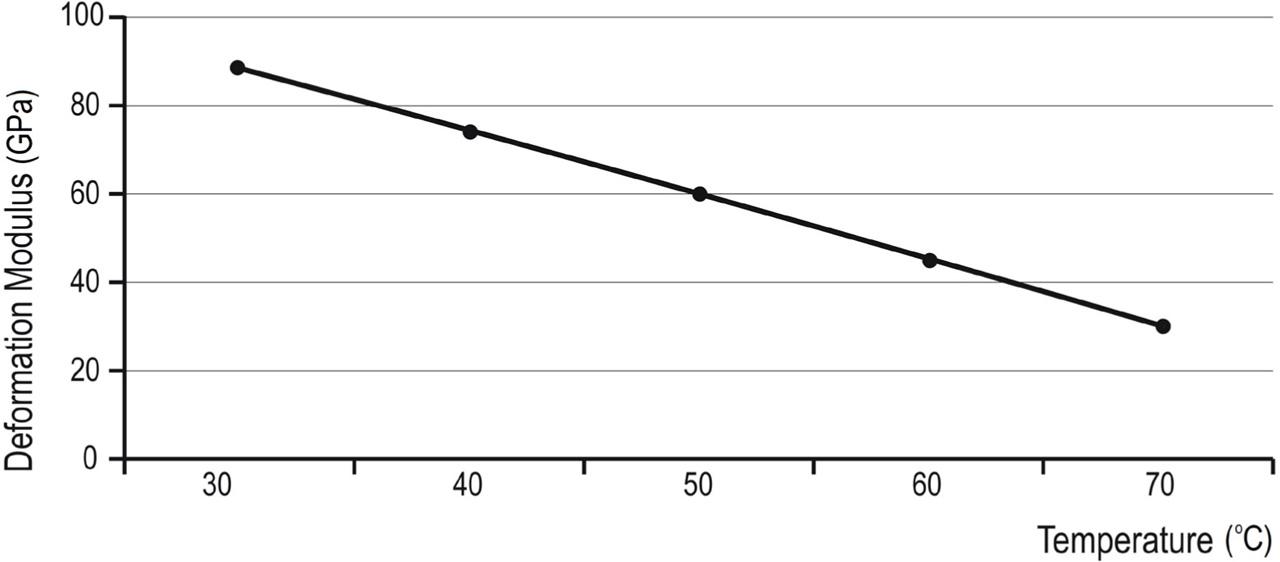 There is little knowledge regarding the behaviour of GRP pipes that are subjected to high temperatures. In 2008, the temperature effect on GRP pipes was analysed and described in paper [6]. According to the authors’ experimental studies, the deformation modulus of GRP pipes decreased with an increase in temperature, as presented in Figure 2. The research included a rise of temperatures from 30°C to 70°C, and for this interval, the deformation modulus decreased by 62%.