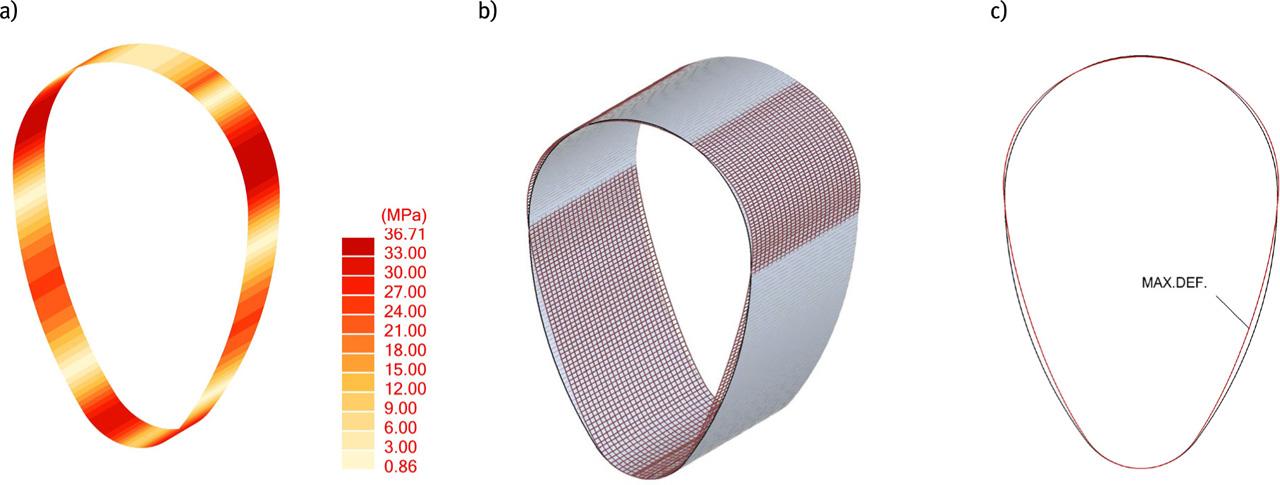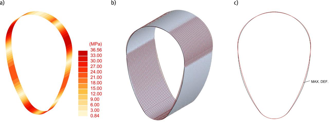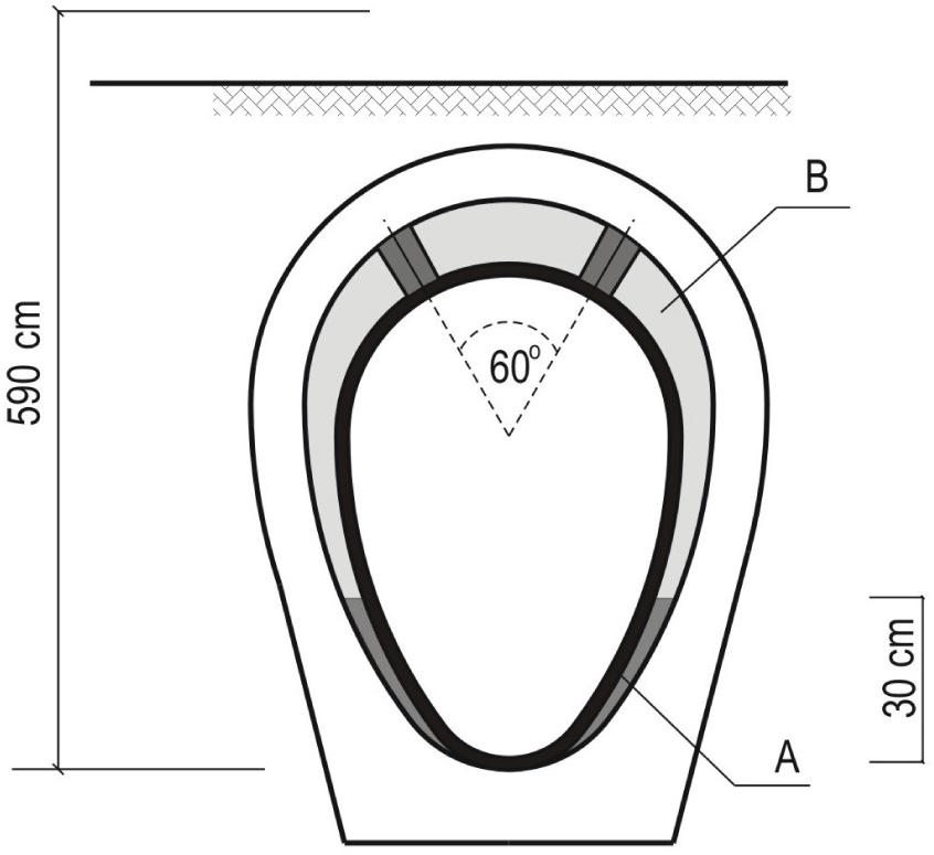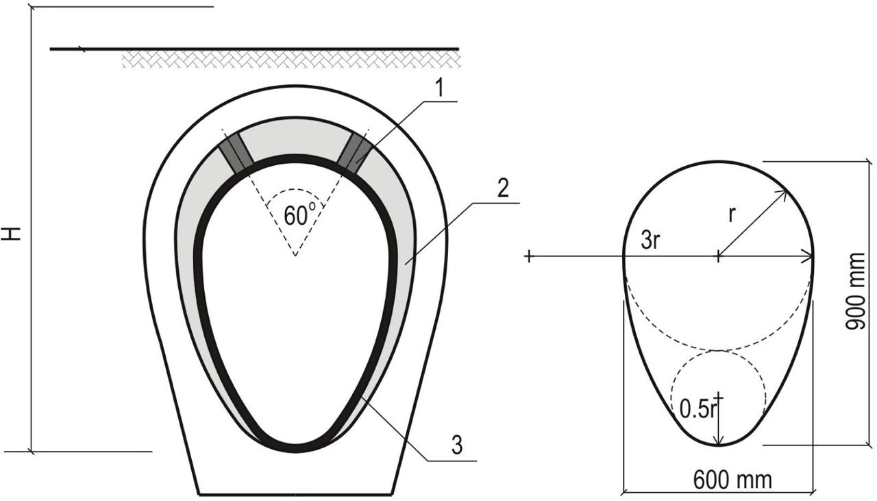 The paper presents an analysis of the behaviour of egg-shaped GRP panels that were used for the renovation of a brick sewer. The panels have a height of 900 mm and a width, which is measured in their widest place, equal to 600 mm. Panels with such dimensions are produced in a wide range of wall thicknesses (from 12 to 22 mm), depending on their purpose. Those with thinner walls can be used as a liner for gravitational sewers, which require an improvement of their hydraulic parameters or have some small cracks. Those with bigger wall thicknesses are usually used to renovate sewers, which are untightened, cracked and can lose their load-bearing capacity. Figure 3 shows the geometric characteristics of the analysed panels.