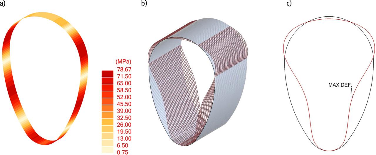 Stress distribution and deformations of the panel when the heat of hydration is equal to 70°C: (a) stress distribution, (b) 3D view of panel deformation, (c) view of panel deformation with an indication of the location where the maximum value occurred.