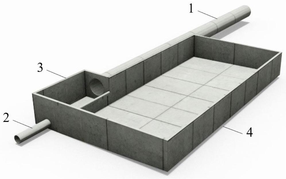 An example of a retention tank (1 - inlet canal, 2 - outlet canal, 3 - flow chamber, 4 – accumulation chamber) [28].