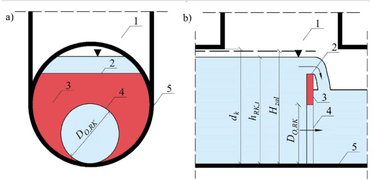 Scheme of the damming partition installed in a sewage manhole (a) cross section; (b) longitudinal section; 1 - sewer manhole, 2 - overflow edge, 3 - piling partition, 4 - flow opening, 5 – canal, DO,RK – diameter of the flow opening, dk - diameter of canal, hRK,t – rainwater height in the canal during the time t, Hzał - maximum acceptable height of rainwater before the damming partition [9].